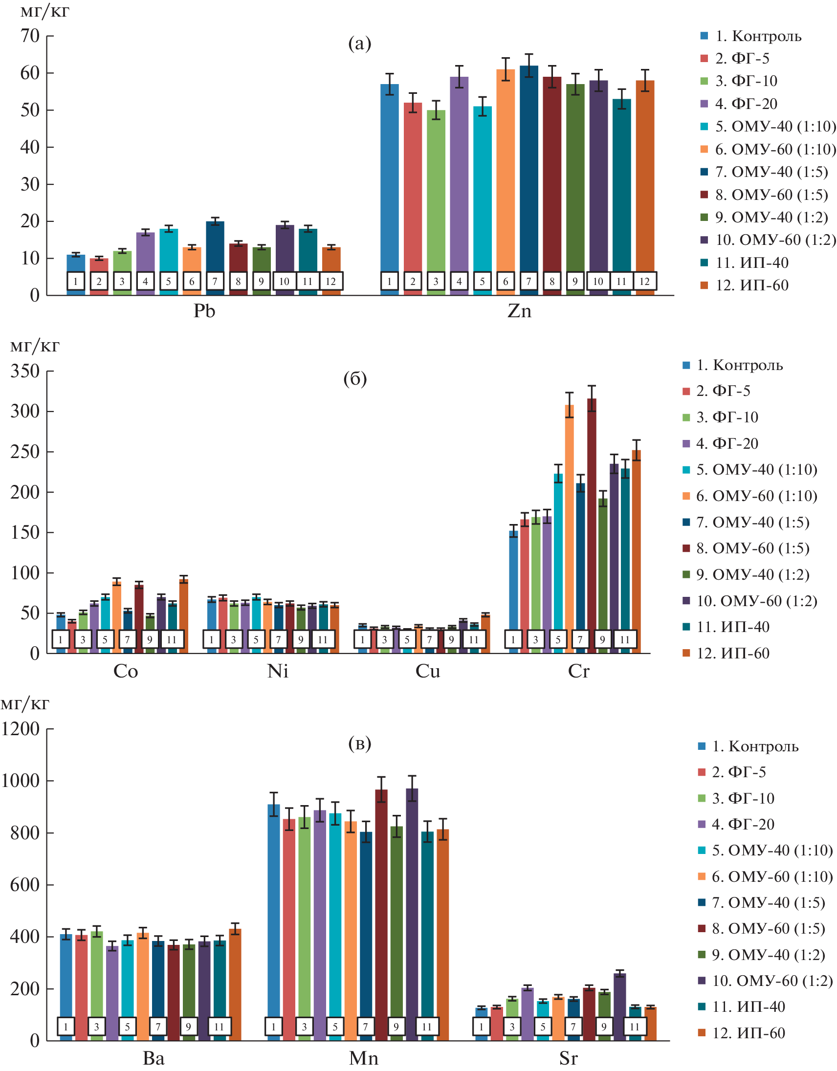 When using by-products and wastes of industrial and agricultural production (phosphogypsum (PG) and turkey litter (TL)) as a fertilizer, it is necessary to take into account not only the content of nutrients, but also environmental safety, including the presence of toxic elements. A small-plot field experiment was conducted on slightly eroded agrochernozem in the forest-steppe zone of the Bashkir Cis-Urals. PG was applied once at doses of 5, 10, and 20 t/ha; TL – in doses of 40 and 60 t/ha; organo-mineral fertilizer (OMF) – 40 and 60 t/ha at ratios of PG and TL 1 : 10, 1 : 5 and 1 : 2. After applying of PG, TL, or OMF into the soil, the content of As, Cd, Hg, Se, Mo, Sb, W, and V remained at the trace level. The content of Zn, Ni, Cu, Ba, and Mn remained practically unchanged compared to the control variant, but was significantly higher than in the initial PG. The content of Pb and Sr increased mainly with the addition of high doses of PG, while those of Co and Cr increased with high doses of TL. In general, the content of elements of three toxicity classes did not exceed the MPC, the total effect of pollution was assessed as permissible.