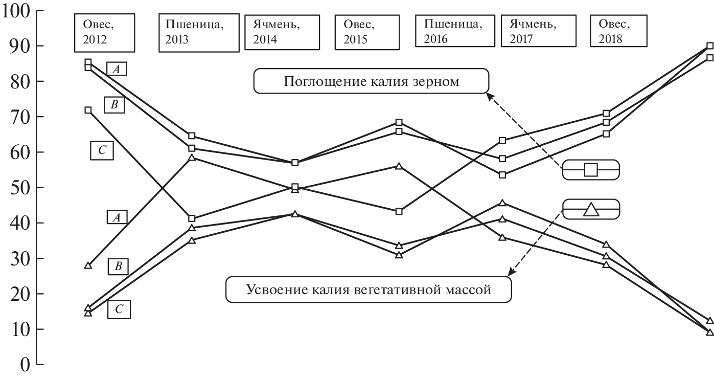 In micro-field experiments conducted on gray forest soil, changes in the forms of potassium under the influence of mineral fertilizers and plant residues were studied. It is shown that the soil potassium contained in a water-soluble and easily exchangeable form varied widely. In the conditions of 2012, when applying K60 on the background of nitrogen and phosphorus, the content of water–soluble potassium increased by about 2 times compared with the control, and the content of light-exchange potassium increased by 4 times. In the case of embedding plant residues in the soil, the potassium content in the water–soluble form increased by 2 times, light-exchange – by 2.5 times, respectively. The content of exchangeable potassium changed little in the variants, the changes affected the non-exchangeable form to a greater extent. In particular, the content of non-exchangeable potassium in 2018 decreased by 1.5–2.0 times compared to 2012, which required the creation of a more reliable basis for obtaining objective information about the state of the potash fund of the soils of the forest-steppe zone. Under the influence of K-fertilizers in combination with plant residues, plant productivity stabilized, and at the same time a positive balance of potassium in the soil was formed.