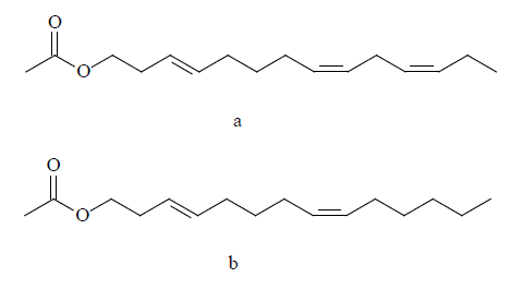 Томатная моль быстро адаптируется к новым условиям обитания и обладает высокой скоростью размножения, поэтому требует приятия незамедлительных и решительных мер по уничтожению. Феромонные ловушки можно эффективно использовать для раннего обнаружения вредителя. Использование синтетических феромонов – один из экологически безопасных методов выявления насекомых и борьбы с вредителями растений. Такие вещества у насекомых являются продуктами сложных биокаталитических реакции, происходящих в ответственной за этот процесс железе. Женский половой феромон Tuta absoluta состоит из 2-х компонентов. Основным компонентом, который составляет ≈90% летучих веществ, содержащихся в половых железах самок, является (3E, 8Z, 11Z)-3, 8, 11-тетрадекатриен-1-илацетат (а). Минорная компонента, составлявшая 10%, была идентифицирована как (3E, 8Z)-3,8-тетрадикадиен-1- ил ацетат (b):
