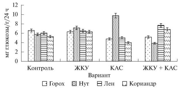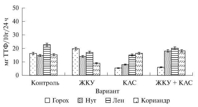 На участках с горохом и нутом при внесении ЖКУ наблюдали увеличение содержания активного углерода (на 24–29% больше контроля). Достоверных отличий на участках со льном и кориандром не было выявлено. Внесение КАС на участках с горохом и кориандром привело к снижению содержания активного углерода (на 14% меньше контроля). Достоверных отличий на участках с нутом и льном не было выявлено. Наибольшее содержание активного углерода было на участках с горохом, льном и кориандром при внесении ЖКУ + КАС (на 26% больше контроля), тогда как на участке с нутом эффект был обратным (на 18% меньше контроля).