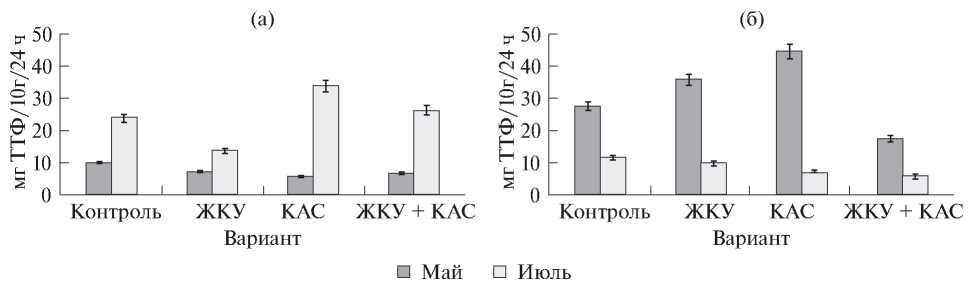 В мае низкие показатели отмечены на участке с горохом при внесении КАС (на 48% меньше контроля) и на участке с нутом при внесении ЖКУ + КАС (на 49% меньше контроля). В июле активность дегидрогеназ была высокой на участках с горохом и нутом при внесении КАС (на 42 и 62% больше контроля). Отрицательное воздействие на участке с горохом оказало действие ЖКУ (на 44% меньше контроля), на участке с нутом – ЖКУ + КАС (на 37% меньше контроля). Отмечена достоверная зависимость между активностью дегидрогеназ и гидротермическими условиями: для температуры – умеренная положительная (r = 0.52), для влажности – умеренная отрицательная (r = –0.69). Степень обогащенности почвы ферментом характеризовалась как “бедная” в течение всего периода наблюдений.