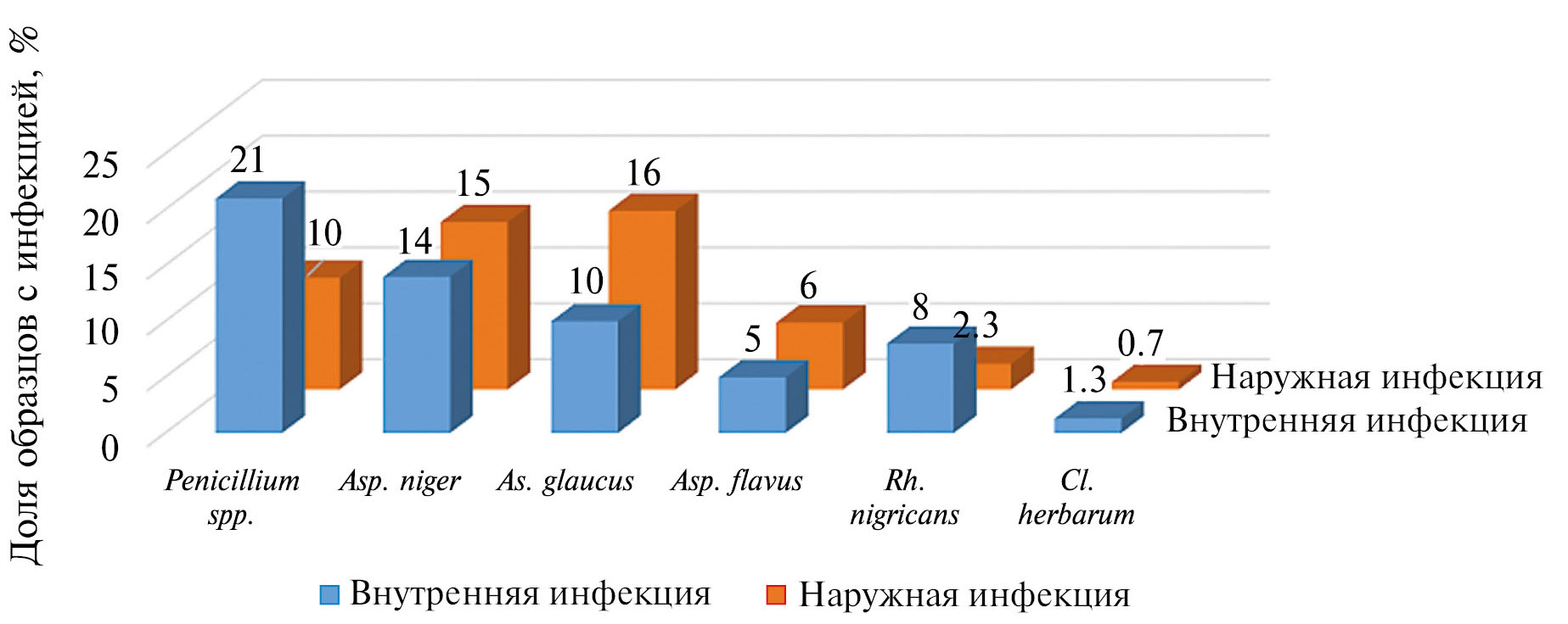 По доле инфицированных образцов отмечено доминирование видов Penicillium и 2-х видов аспергиллов – A. niger и A. glaucus. Образцов с внутренней инфекцией в группе Penicillium spp., а также среди видов R. nigricans, Cl. herbarum было больше, чем с наружной, у всех видов выделенных аспергиллов преобладала наружная инфекция.