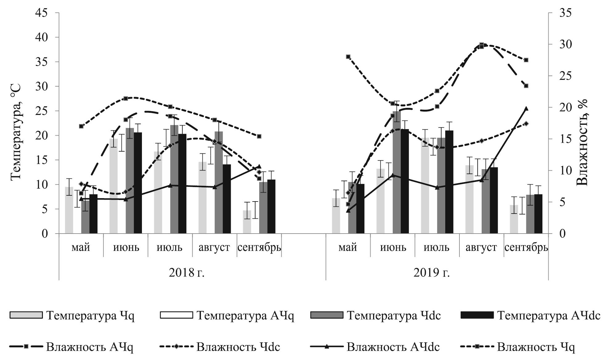 Рис. 2. Влажность и температура черноземов за вегетационный период 2018–2019 гг.