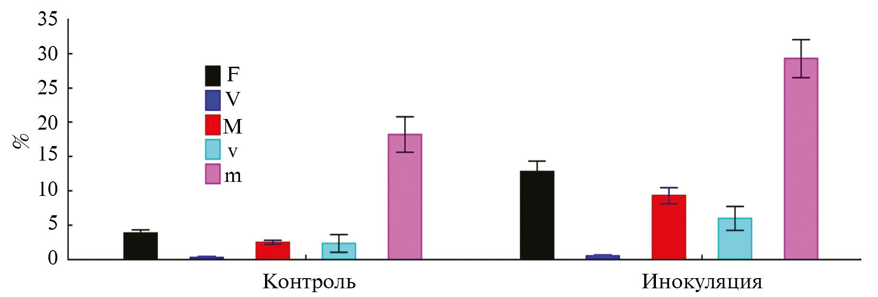 Рис. 1. Средние для всех выращенных на загрязненной ТМ дерново-подзолистой почве генотипов гороха величины параметров развития микоризных структур. Параметры микоризации корней: встречаемость микоризной инфекции (F), обилие арбускул в образце (М), обилие арбускул в микоризованных фрагментах (m), обилие везикул в образце (V) и обилие везикул в микоризованных фрагментах (v). Вертикальные отрезки обозначают ошибки средних.