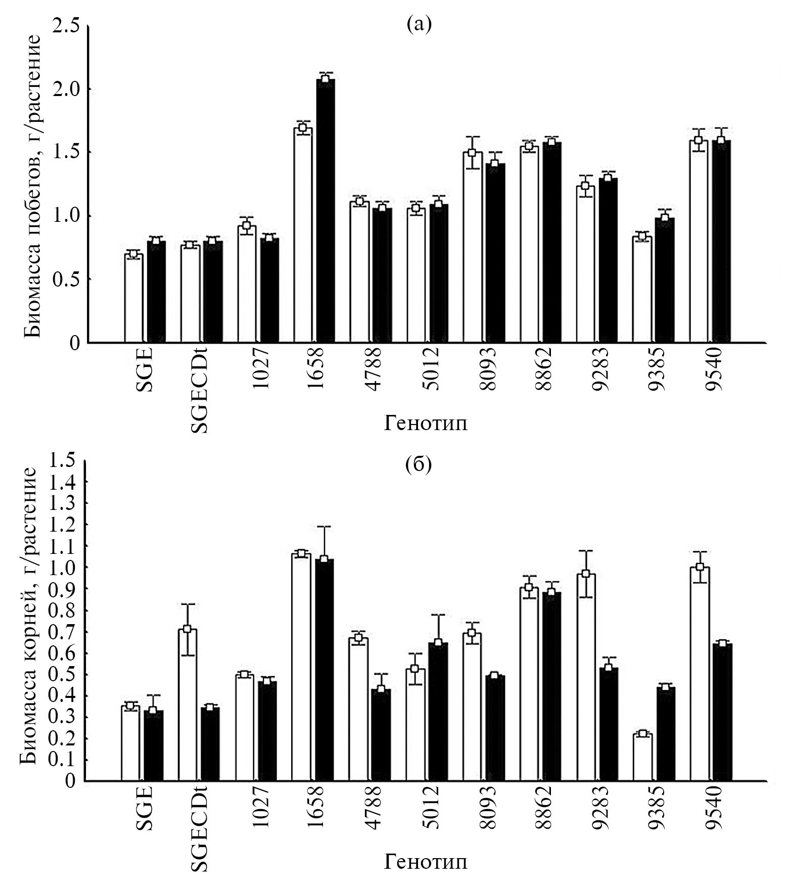 Рис. 2. Влияние инокуляции на накопление биомассы побегов (а), биомассы корней (б). □ – неинокулированные растения, ■ – инокулированные растения. Вертикальные отрезки обозначают ошибки средних. Генотипы расположены слева направо по увеличению их коллекционного номера.