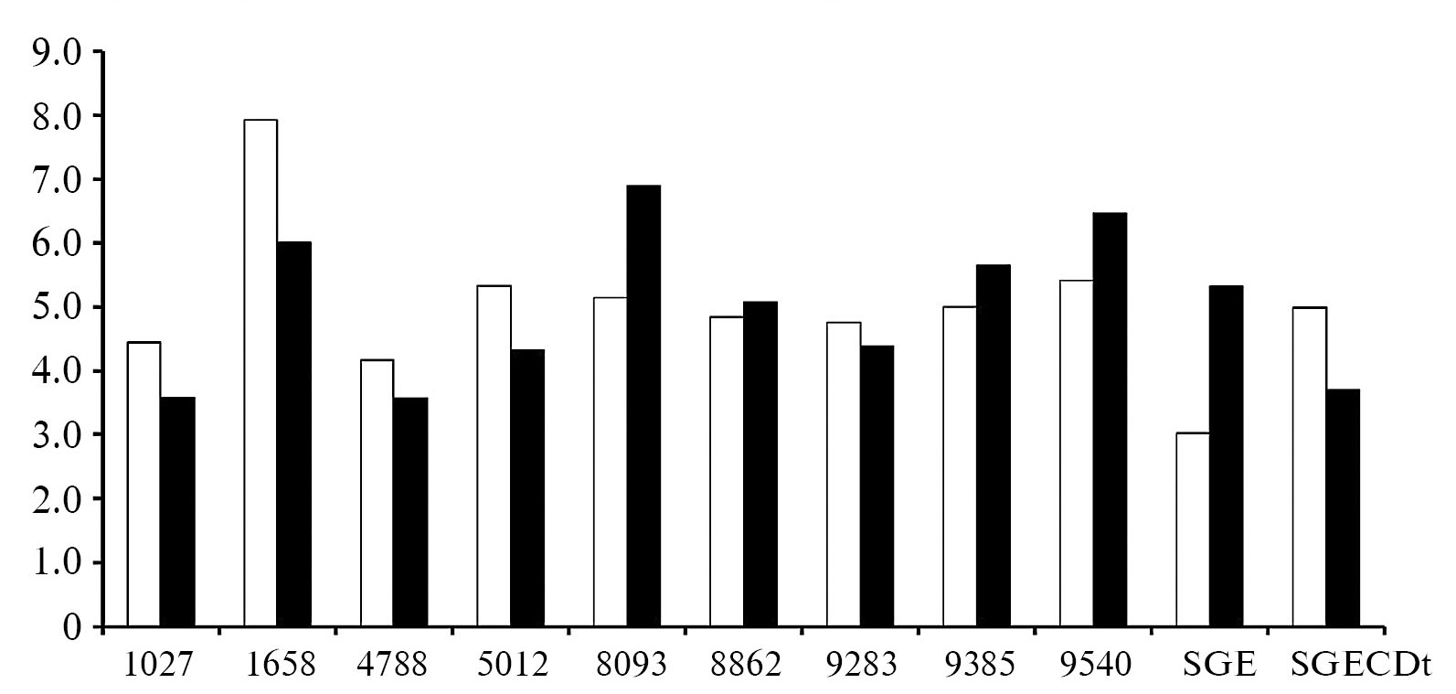 Исключение составили растения генотипа 1658, где в инокулированных образцах в сравнении с контролем биомасса побегов увеличилась примерно на 25%, и генотип 9385, инокуляция которого увеличила биомассу корневой системы почти в 2 раза. Были отмечены также случаи, когда инокуляция растений приводила к снижению роста корневой системы. Например, для генотипов SGECDt, 9283 и 9540 биомасса корней в опытном варианте была приблизительно в 2 раза меньше, чем у контрольных растений.