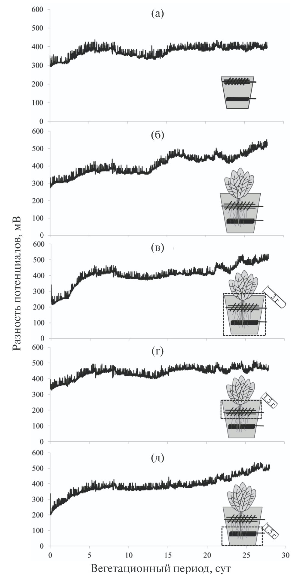 Рис. 2. Динамика разности потенциалов в корнеобитаемой среде в БЭС различного состава, варианты: (а) – БЭС-К (контроль без растений), (б) – БЭС-Р (с салатом сорта Тайфун), (в) – БЭС-ГК (с внесенными в субстрат ГК), (г) – БЭС-ГКв (с добавленными ГК в верхнюю приэлектродную область), (д) – БЭС-ГКн (с внесенными ГК в область нижнего электрода). То же на рис. 3.