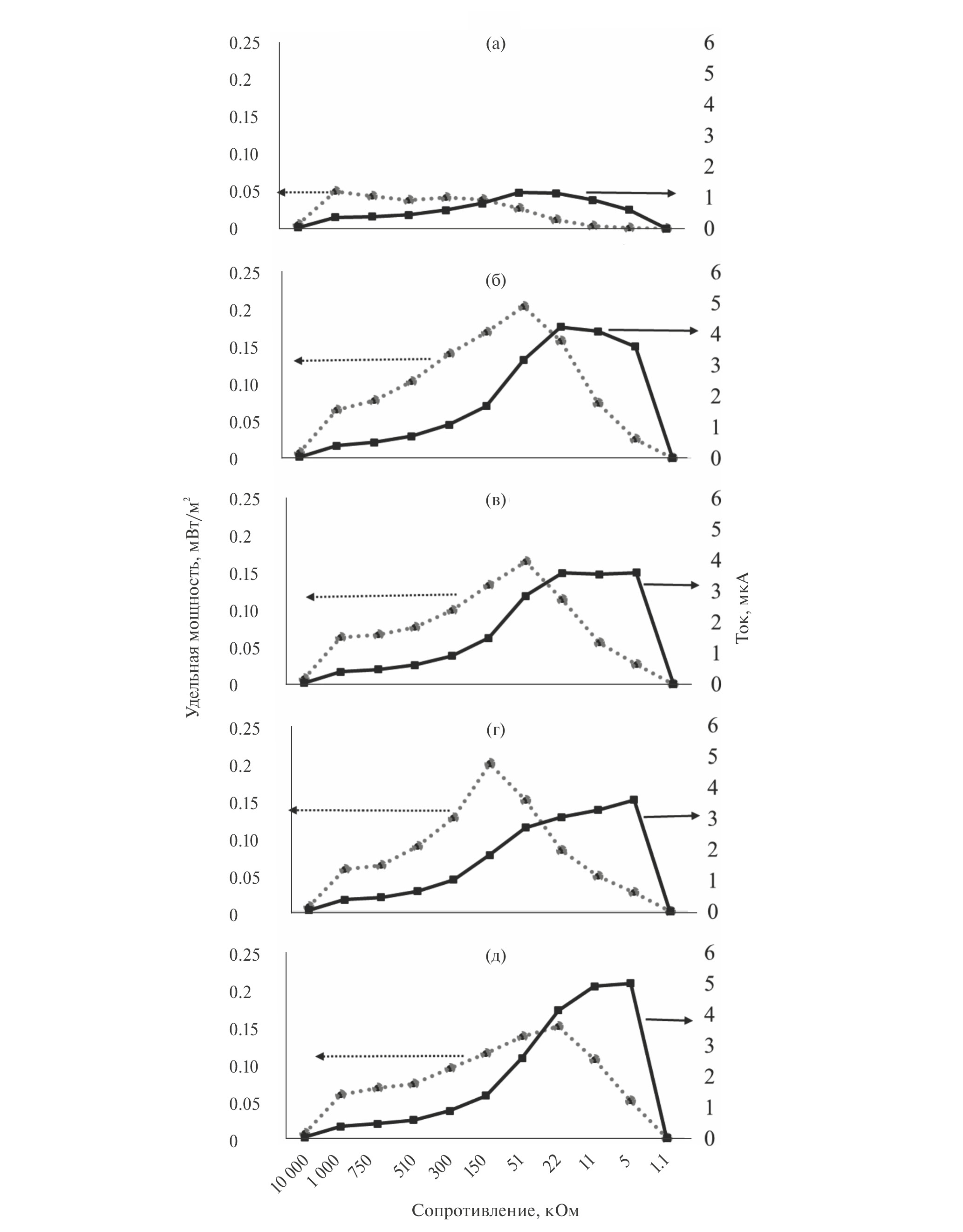 Наибольшая полученная удельная мощность 0.2 мВт/м2 была характерна для вариантов БЭС-Р и БЭС-ГКв, а наибольшая сила тока 5 мкА была получена в варианте БЭС-ГКн.