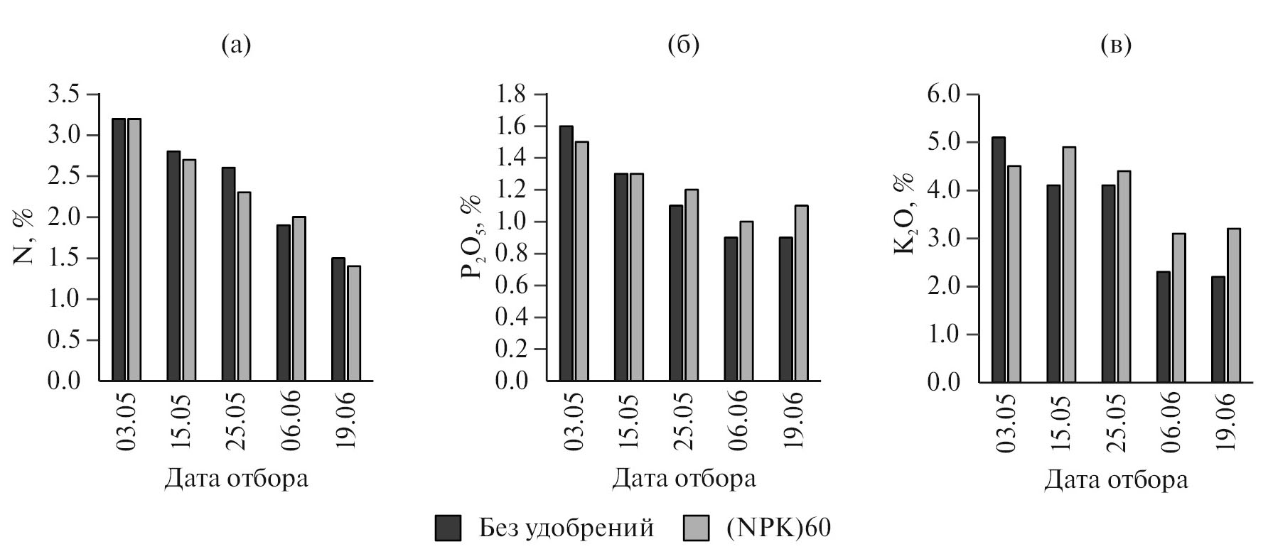Вегетирующие растения нуждаются в постоянном притоке элементов минерального питания, которые они получают из почвенного раствора, воздушной или водной среды. Известно, что через листья растения получают >95% углекислого газа, а путем некорневого питания могут усваивать из водных растворов зольные элементы и азот. Основное количество азота, воды и зольных питательных веществ поступает из почвы через корневую систему. Содержание азота, фосфора и калия – основных элементов минерального питания в листьях левзеи сафлоровидной снижалось в процессе вегетации растений и было минимальным в период формирования семян. Молодые листья левзеи до фазы цветения содержали 2.3–3.2% азота, 1.1–1.6% фосфора и 4.1–5.1% калия (рис. 1).