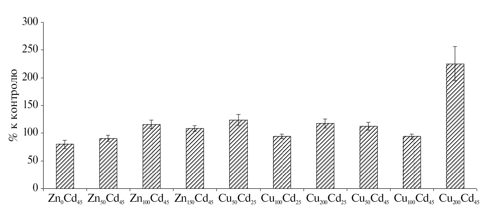 Полученные результаты отличались в зависимости от состава и концентрации внесенных в почву металлов. При внесении одного кадмия в дозе 45 мг/кг содержание антиоксидантов возрастало в среднем до 120% от контроля. Это говорит о том, что в тканях растений все же наблюдался повышенный выход свободных радикалов (хотя это и не приводило к значимому росту содержания МДА (рис. 3)), на что организм отвечал повышенным синтезом антиоксидантов. Добавление в почву цинка практически не меняло величины этого показателя, только при дозе цинка 150 мг/кг он снижался до 65% от контроля. Такие результаты свидетельствовали о том, что цинк, обладая низкой токсичностью, не вызывал развития окислительного стресса в диапазоне доз 50–150 мг/кг. Поэтому при внесении цинка не наблюдали ни угнетения роста и развития растений, ни повышенного образования МДА. Снижение количества антиоксидантов при максимальной дозе цинка можно увязать с развитием стимулирующего эффекта при действии данного ТМ в изученной концентрации (рис. 1, 2). Вероятно, окислительный стресс купировался какими-то иными механизмами, активно работающими в условиях возросшей интенсивности метаболизма.