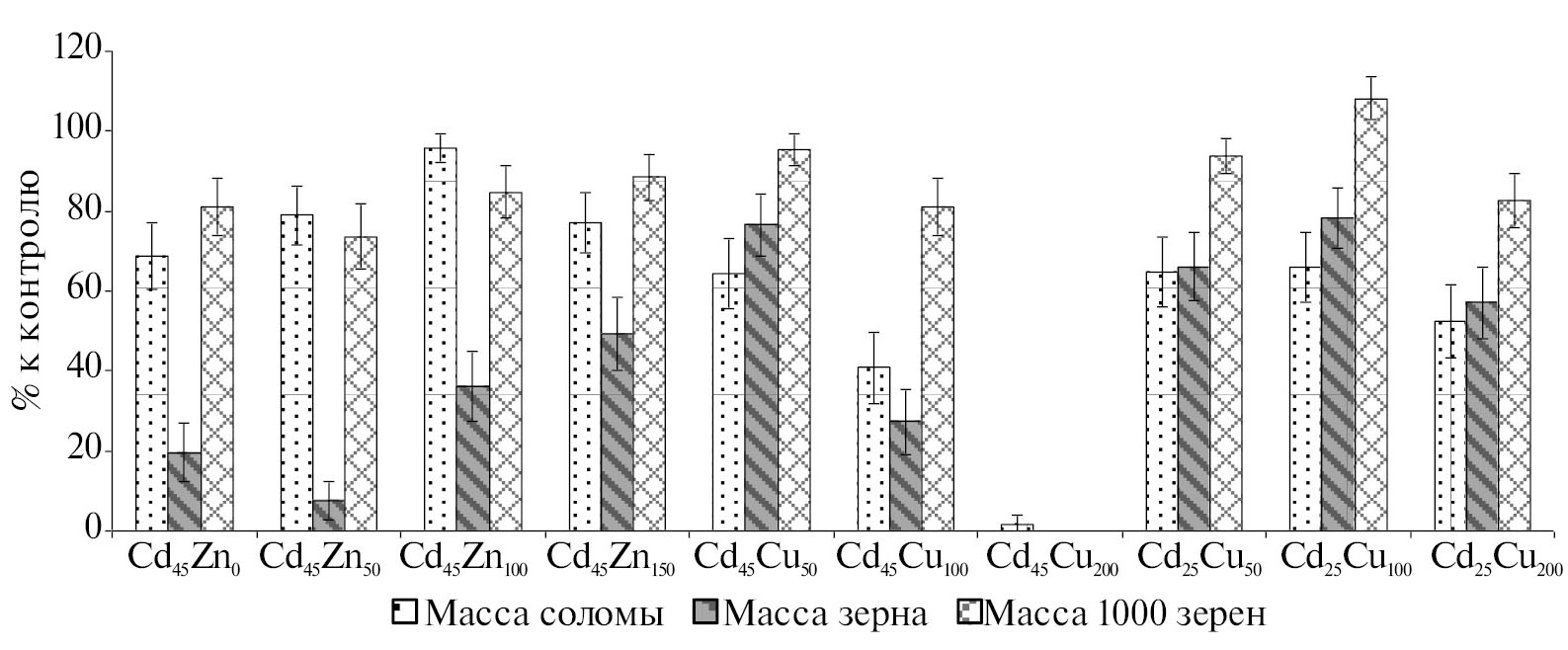 Внесение меди оказывало стимулирующее действие и на развитие вегетативной биомассы, и урожая семян, но при этом сама медь оказывалась более опасным ТМ, чем цинк. Потому наиболее отчетливо ее стимулирующее действие проявлялось при меньшей (25 мг/кг) дозе кадмия, а при большей (45 мг/ кг) быстро развивалось глубокое угнетение растений. Хотя можно отметить, что при внесении меди удавалось в целом получить больший урожай, чем в случае с цинком, и пустых колосьев встречалось немного. Тем не менее, учитывая наблюдаемые закономерности, логично предположить, что в настоящем исследовании еще не был полностью раскрыт стимулирующий потенциал цинка, при дальнейшем увеличении его дозы удалось бы в большей степени сократить воздействие вызванного кадмием стресса, еще не достигнув того предела, за которым оба ТМ проявляли себя исключительно как токсиканты.