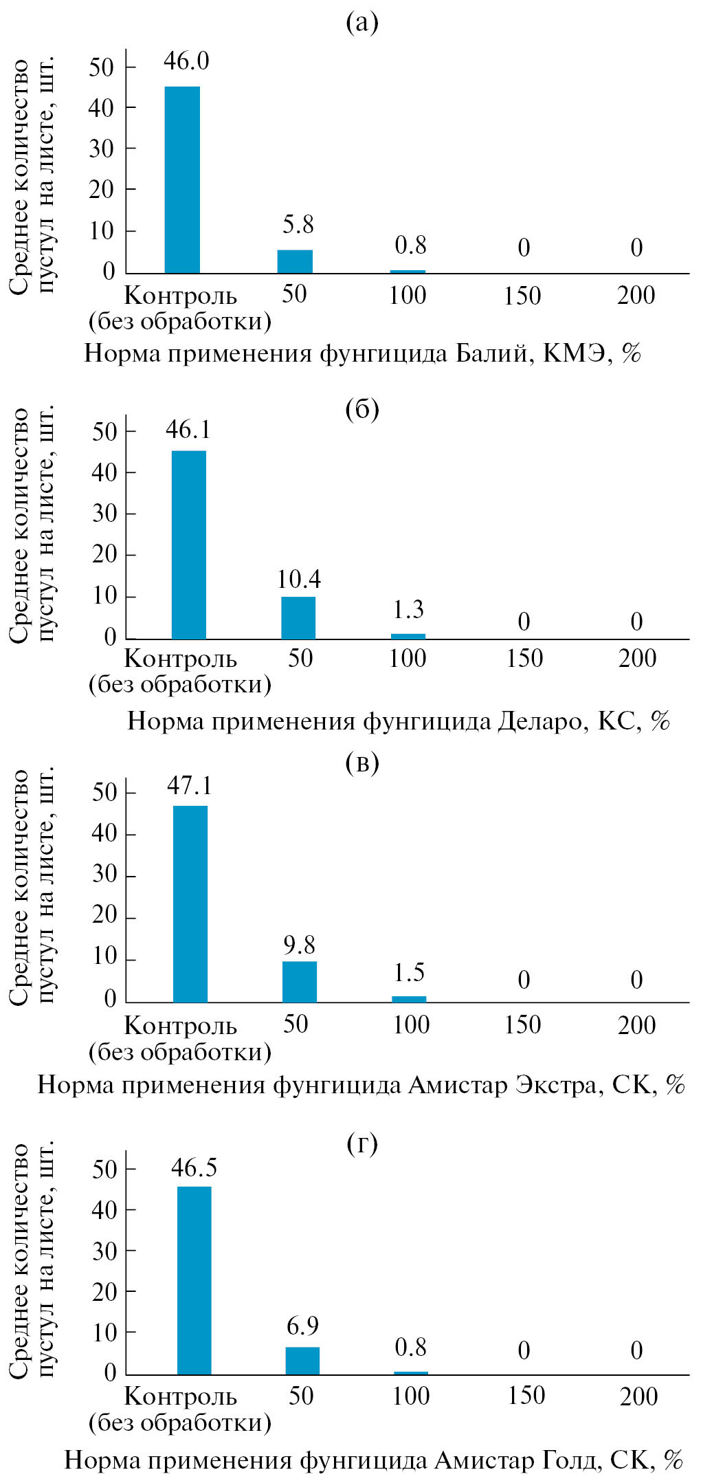 Рис. 1. Изменение среднего количества пустул карликовой ржавчины ячменя на листе под действием фунгицидов: (а) – Балий, КМЭ, (б) – Деларо, КС, (в) – Амистар Экстра, СК, (г) – Амистар Голд, СК.