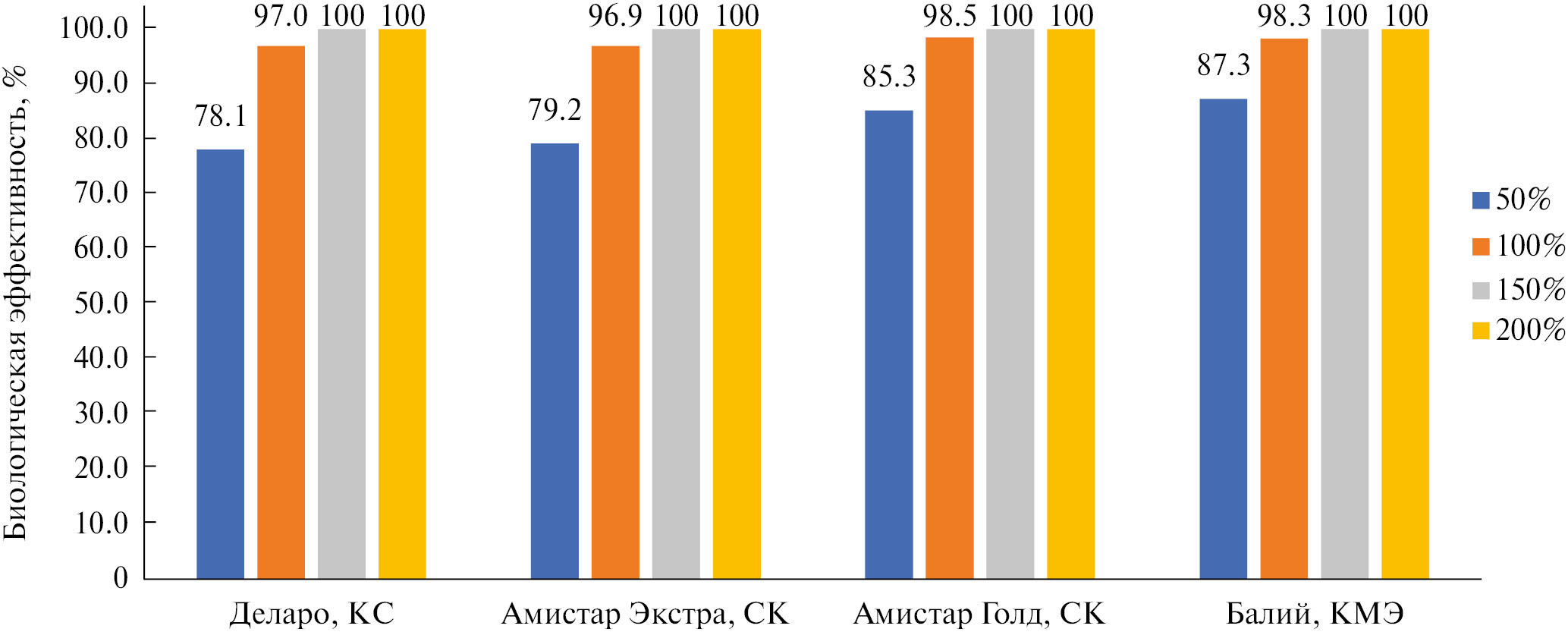 Биологическая эффективность против карликовой ржавчины у всех фунгицидов была высокой (рис. 3). При обработке растений ячменя озимого пониженной нормой применения (50%) эффективность препарата Деларо, КС составила 78.1, Амистар Экстра, СК – 79.2, Амистар Голд, СК – 85.3, Балий, КМЭ – 87.3%. При обработке рекомендованной нормой применения эффективность фунгицида Амистар Экстра, СК составила 96.9, Деларо, КС – 97.0, Балий, КМЭ – 98.3, Амистар Голд, СК – 98.5%.