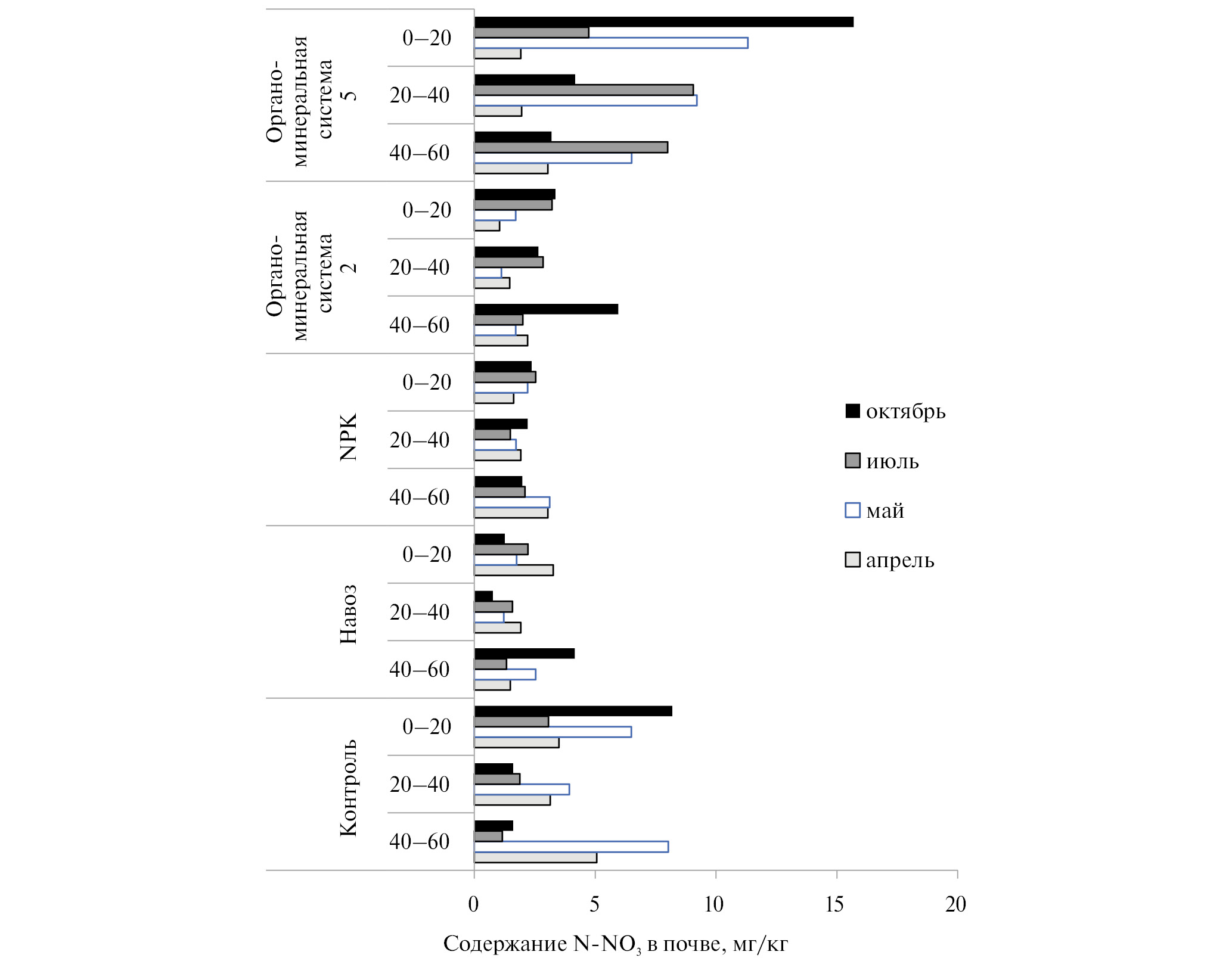 Рис. 4. Содержание нитратного азота в почве в зависимости от различных систем удобрения.