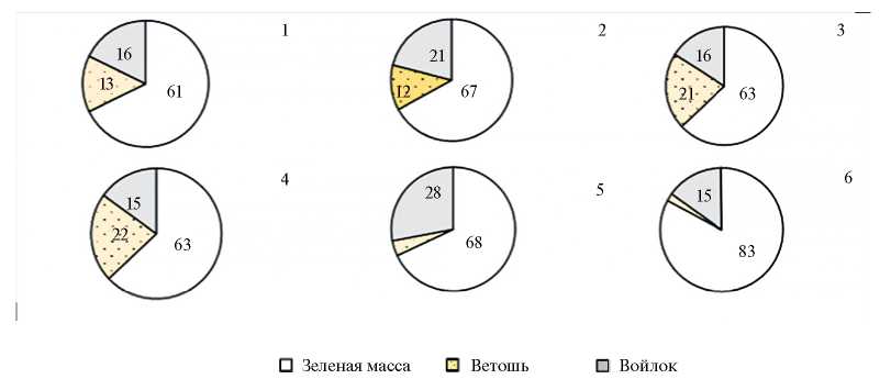 Рис. 2. Распределение фитомассы леймусовых сообществ, % от общей наземной массы, 1, 2, 3, 4, 5, 6 – номера сообществ.