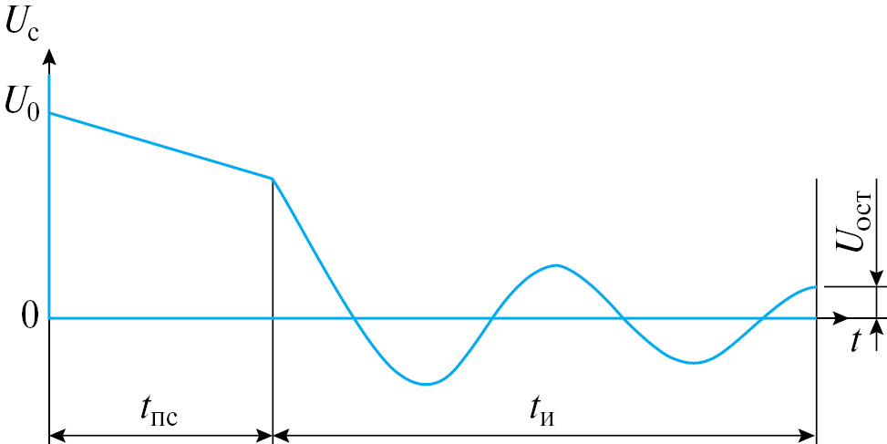 Наиболее неопределенными из параметров, входящих в выражение (2), являются tПС и UОСТ. Названные параметры показаны на рис. 1, где приведена осциллограмма напряжения на накопительном конденсаторе UС емкостной системы зажигания в течение разрядного процесса. Эти параметры даже в течение одного цикла запуска газотурбинного двигателя могут изменяться в достаточно широких пределах вследствие специфического механизма развития разрядов в полупроводниковых свечах зажигания и воздействия на свечу в камере сгорания широкого круга возмущающих воздействий (температура, давление, поток топливовоздушной смеси) [1].