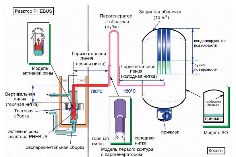 В эксперименте использована модель реактора PWR мощностью 900 МВт (эл.) [9], построенная в масштабе 1/5000 в части первого контура и защитной оболочки. Компоненты экспериментальной сборки имитировали основные конструкции реакторной установки PWR. Моделировались следующие составляющие энергоблока: активная зона, горячая нитка первого контура, U-образная трубка парогенератора, холодная нитка первого контура и ЗО. Схематическое изображение установки Phebus FPT1 показано на рис. 1.