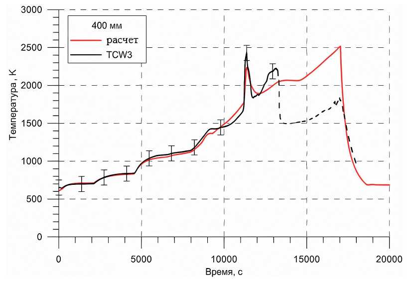 Результаты моделирования эксперимента при помощи СОКРАТ/В3 продемонстрировали корректное воспроизведение фаз разогрева (с 0 до 8000 с), окисления (10000–11600 с) и плавления модельной сборки (11000–17000 с), включая стекание материалов, теплообмен излучением в сильно поврежденной геометрии, прямое взаимодействие топливных таблеток со средой в канале. Тренды расчетных температур оболочек твэлов по всей высоте сборки воспроизводят тренды измеренных температур, расчетные температуры совпадают или лежат вблизи измеренных значений в пределах погрешностей измерений (за исключением поздней фазы разрушения сборки, где становится существенной неоднородность поля температур по сечению – рис. 2). Кроме того, в расчете наблюдается корректное воспроизведение суммарного количества образовавшегося водорода (рис. 3).