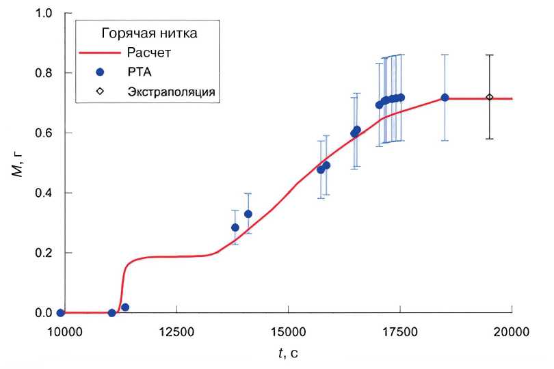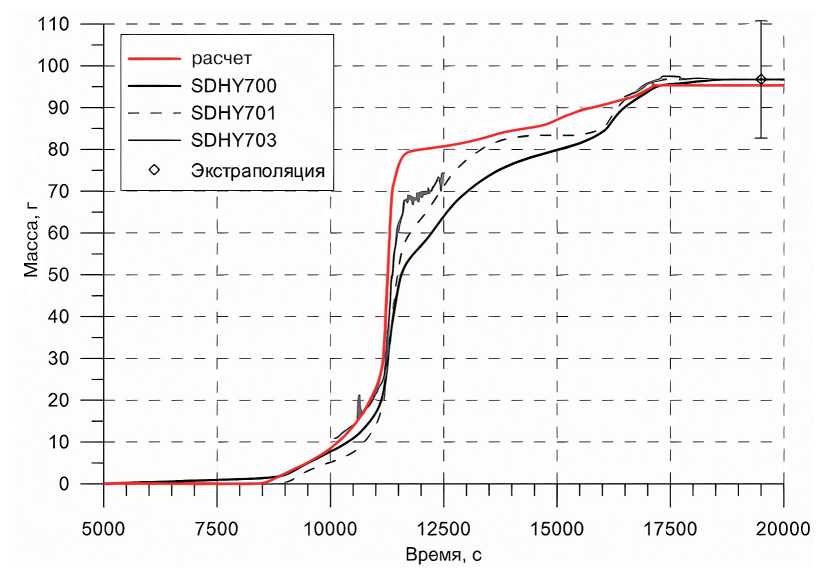 На рис. 6 показана интегральная масса йода, поступившая в ЗО. При сравнении с экспериментальными данными по динамике расхода можно сделать вывод о том, что пары CsI, так же как и пары CsOH, частично конденсировались в пространстве над сборкой, где находились поверхности с низкими температурами, а потом постепенно испарялись при нагреве этих поверхностей (при увеличении тепловой мощности сборки и температуры выходящего газа).
