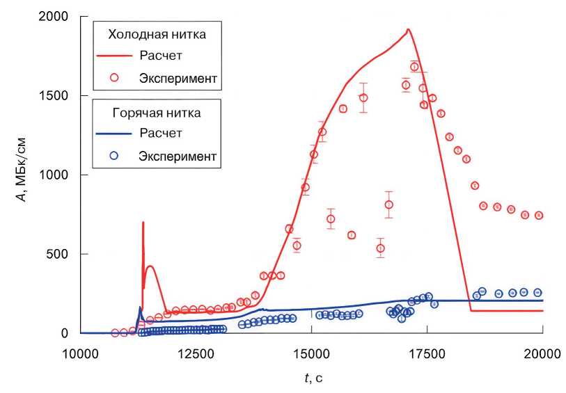 Рис. 4. Линейная плотность активности изотопа 137Cs в горячей и холодной нитках в эксперименте Phebus FPT1.