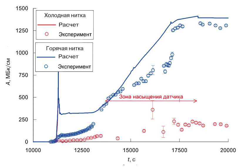 Расчетное поведение изотопа йода 131I в холодной нитке также демонстрирует хорошее совпадение с экспериментальными данными (рис. 5). Данные по горячей нитке носят информативный характер, поскольку на части временного интервала активность была выше диапазона измерений датчика. Полученные значения по коду СОКРАТ/В3 соответствуют данным измерений и данным из работы [10].