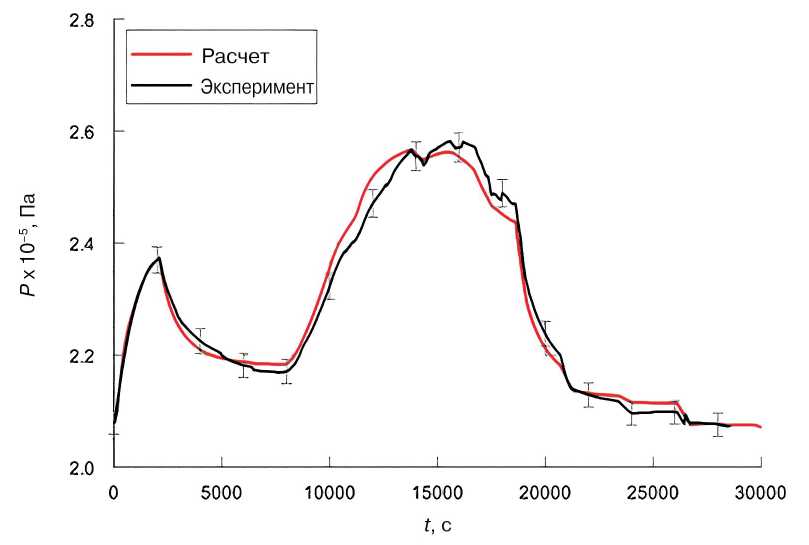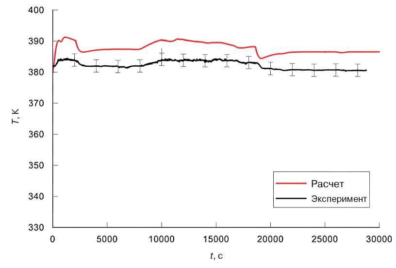 Моделирование процессов в ЗО проводилось в упрощающем предположении о линейной скорости отбора среды (в интервалах пробоотбора) и фиксированной температуре стен. Начальная влажность атмосферы под ЗО была подобрана из условия наилучшего совпадения давления в интервале 0–2000 с (рис. 7). Относительное отклонение расчетного давления в ЗО на интервале 0–27000 с составило 0.1%, среднеквадратическое отклонение – σPRESS = 0.8%. Температура газа, приведенная на рис. 8, в расчете коду СОКРАТ/В3 соответствует среднеобъемной температуре. Экспериментальная температура измерялась в верхней части ЗО, в области теплообменника-конденсатора. Абсолютное отклонение расчетной температуры газа в ЗО на интервале 0–27000 с составило 5.5 K, среднеквадратическое отклонение – σTEMP = = 1.0 K.
