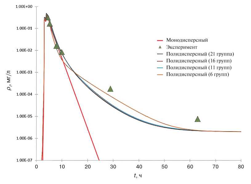Последующий анализ результатов эксперимента показал, что доминирующими формами ряда значимых РВ под ЗО должны были стать аэрозольные частицы. Соответственно, эволюция концентрации ряда РВ под ЗО на длительной стадии осаждения может описываться моделями переноса и поведения аэрозолей. В рамках такого допущения в ходе численного моделирования эксперимента удалось корректно воспроизвести эволюцию концентрации соединений цезия. Причем для начальной стадии осаждения (с 15000 до 40000 с) изменение концентрации с приемлемой точностью описывается монодисперсной моделью, не учитывающей влияние размерного спектра аэрозолей на интенсивность выведения (рис. 9). Корректное воспроизведение снижения концентрации на более поздних стадиях (от 4000 с до 80 часов) требует учета изменения размерного спектра аэрозолей. Соответственно, в рамках расчетов использовалась также и полидисперсная модель, позволяющая учесть как влияние различий в размерах частиц на скорость их осаждения, так и влияние изменения их размерного спектра за счет коагуляции. Для полидисперсной модели число размерных групп варьировалось (рассматривались числа размерных групп 6, 11, 16, 21). Полученные для полидисперсного приближения результаты демонстрируют, что для случаев 11, 16 и 21 размерной группы отличия в расчетных оценках составляют значения, существенно меньшие отклонений от эксперимента (рис. 9). Важно отметить также и хорошее совпадение с монодисперсной моделью на начальной стадии (до 40000 с).