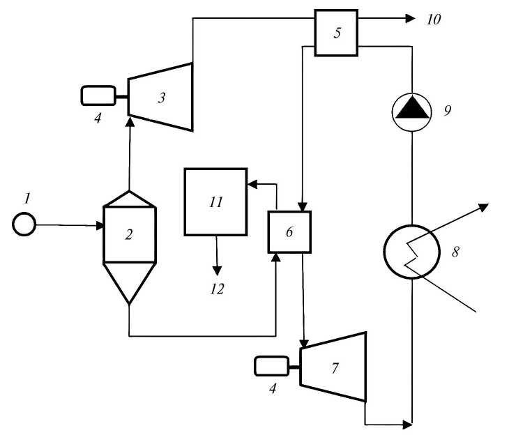 Рис. 1. Технологическая схема комплексного освоения высокотемпературных геотермальных рассолов: 1 – геотермальная скважина; 2 – сепаратор–пароотделитель; 3 – паровая турбина; 4 – генератор; 5 – теплообменник; 6 – испаритель–перегреватель; 7 – турбина на низкокипящем рабочем теле; 8 – конденсатор; 9 – циркуляционный насос; 10 – охлажденный дистиллят; 11 – завод по извлечению химических компонентов; 12 – опресненная вода.