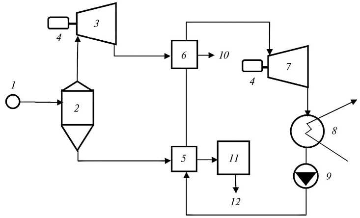 В схеме на рис. 5 термальная вода из добычных скважин 1 поступает в геотермальный центральный тепловой пункт 2. Часть воды подводится в биореакторы 3 (метантенки), остальная вода направляется в блок комбинированной геотермально–парогазовой электростанции (ГПЭС) 6. В биореакторе из биомассы получают обеззараженные удобрения высокого качества 9 и биогаз. После осушки биогаз поступает в ГТУ 5, где вырабатывается электроэнергия. Отработанные в цикле ГТУ выхлопные газы направляются в ГПЭС, где за счет термальной воды осуществляется нагрев низкокипящего рабочего тела в цикле Ренкина до температуры насыщения, а дальнейшее испарение и перегрев тела осуществляется за счет утилизации тепла отработанных газов в цикле Брайтона. Далее отработанные газы поступают в блок по выращиванию белково–витаминной биомассы 7. Отработанная вода из биореактора и ГПЭС поступает на насосную станцию для закачки по нагнетательным скважинам 8 в материнский пласт.