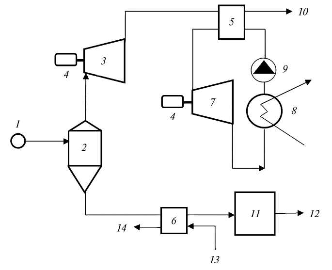 Рис. 3. Технологическая схема комплексного освоения высокотемпературных геотермальных рассолов: 1 – геотермальная скважина; 2 – сепаратор–пароотделитель; 3 – паровая турбина; 4 – генератор; 5, 6 – теплообменник; 7 – турбина на низкокипящем рабочем теле; 8 – конденсатор; 9 – циркуляционный насос; 10 – на водохозяйственные цели; 11 – завод по извлечению химических компонентов; 12 – опресненная вода; 13 – подвод низкотемпературного теплоносителя; 14 – на теплоэнергетические нужды.