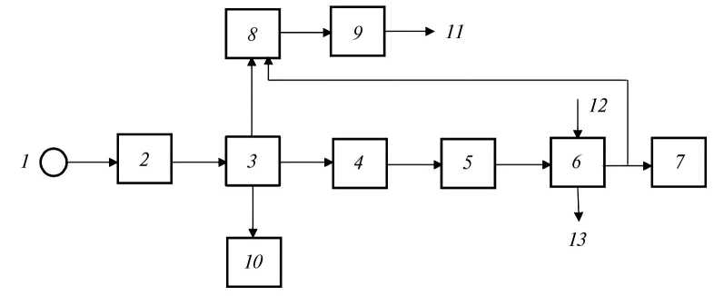Рис. 4. Схема комплексного освоения гидрогеотермальных ресурсов: 1 – скважина; 2 – бинарная ГеоЭС; 3 – метантенк; 4 – газгольдер; 5 – ГТУ; 6 – теплообменник; 7 – блок по выращиванию белково–витаминной биомассы; 8 – теплица; 9 – рыборазводный бассейн; 10 – обеззараженные удобрения; 11 – сброс отработанной воды; 12 – подвод холодной воды; 13 – отвод нагретой воды.