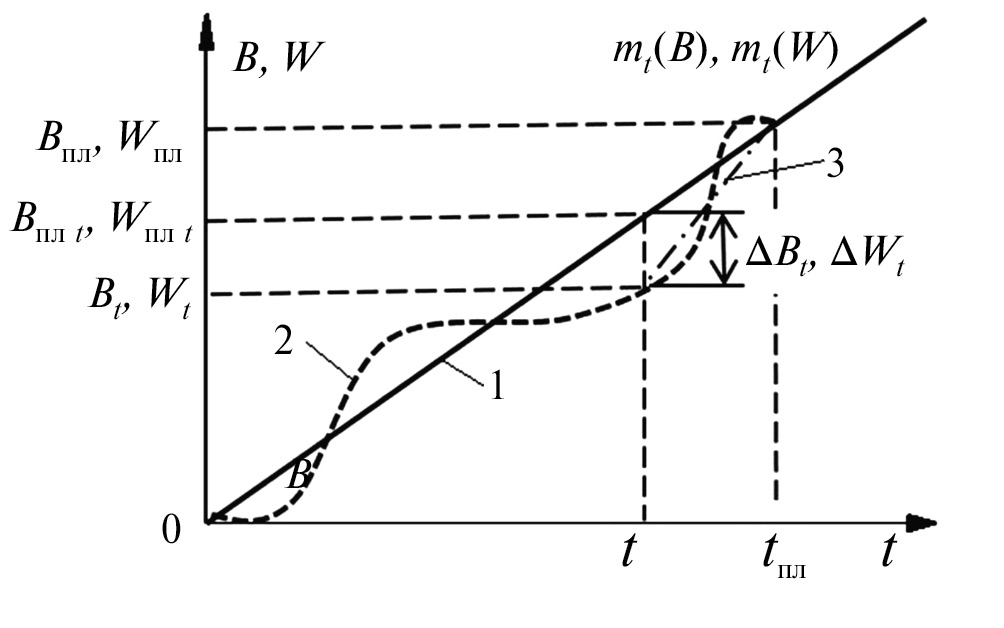 Рассмотрим процесс выпуска продукции в соответствии с планом (заданием) на основе вероятностных методов анализа. Очевидно, что отклонения технологических параметров и электропотребления даже по двум договорам на производство равных объемов одинаковой продукции могут значительно отличаться. Для двух одинаковых заказов, имеющих одинаковые отклонения от плановых значений ∆В и ∆W для определенного момента времени t, они могут отличаются. Если в одном случае технологический процесс может находиться в начальной стадии, то в другом случае – в завершающей стадии.
