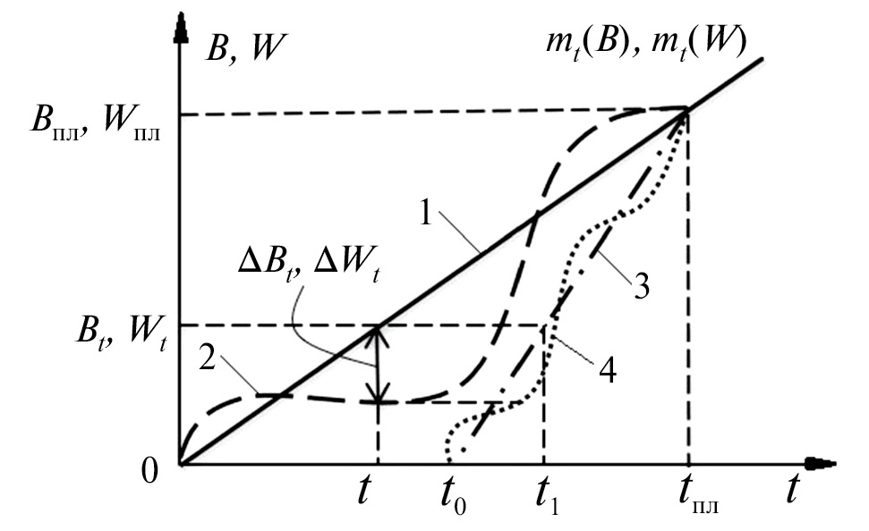 В общем случае это нестационарный случайный процесс [22], в предположении, что планируемые величины Bпл(t), Wпл(t) на момент t представляются математическими ожиданиями по объему выпуска продукции и электропотреблению: