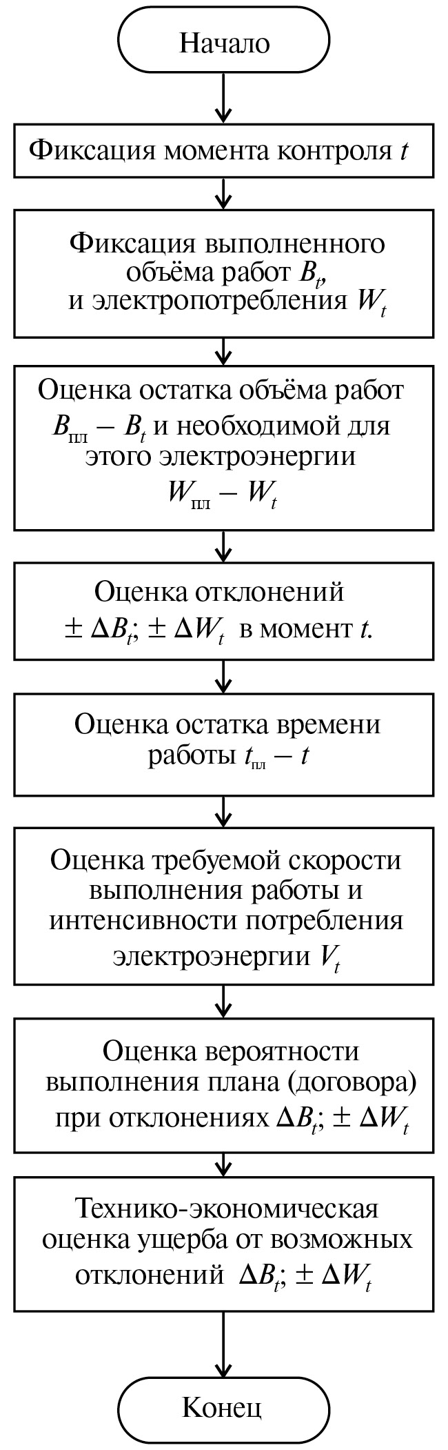 Ожидаемое состояние производственной системы характеризуется вероятностью выполнения объема работ p(Bt) и, соответственно, вероятностью электропотребления p(Wt) в момент времени t. Система контроля фиксирует в момент t фактические значения Bt и Wt. Вероятность выпуска полного объема продукции в соответствии с договором определяется вероятностью выпуска недостающего объема продукции за время tплt [22].