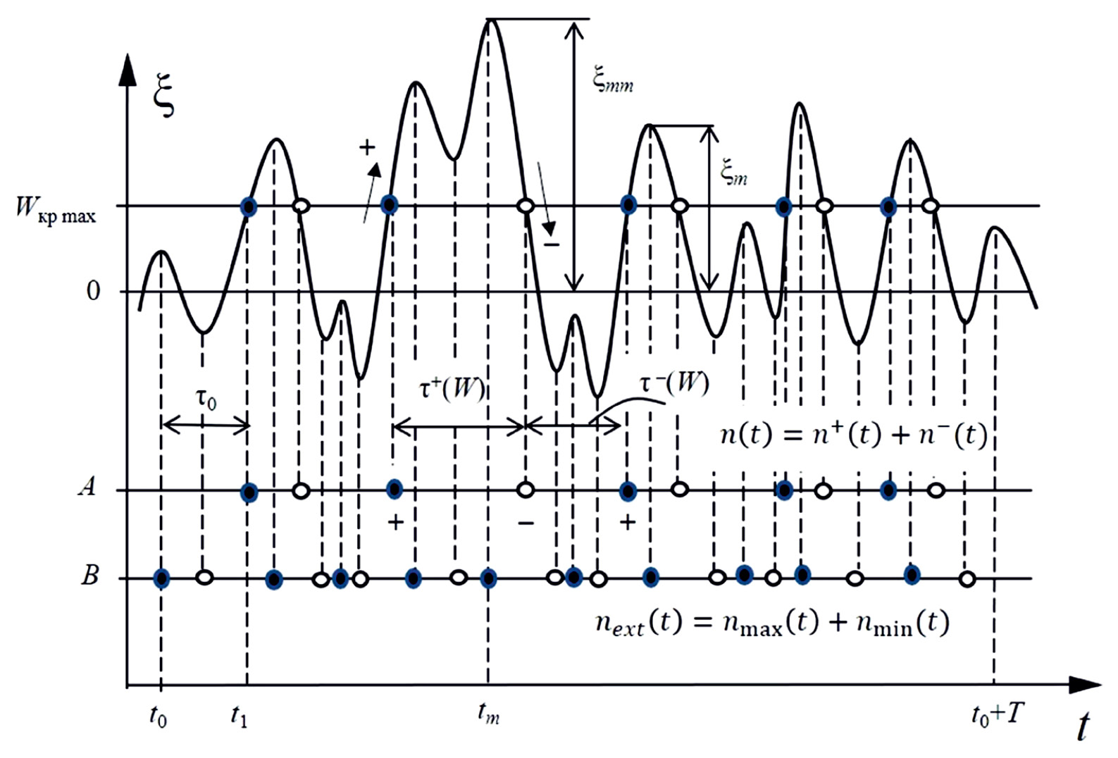 Величины τ+(W) = τ+–(W) и τ(W) = τ–+(W) – это длительности положительных и отрицательных выбросов между положительными (+) и отрицательными () пересечениями критического уровня Wкр max. В момент времени t = t1 траектория ξ(t) впервые выходит за предел Wкр max, а время его достижения – τ0. Функция ξ(t) на интервале T < ∞ имеет конечное число максимумов nmax(T) и минимумов nmin(T) с различными амплитудами ξm. В момент времени tm траектория ξ(t) достигает абсолютного максимума ξmm. Такой подход позволяет описать траекторию ξ(t) определенным числом ее экстремальных амплитуд с указанием длительности интервалов между отдельными экстремумами. Это требуется для создания системы автоматического управления электропотреблением.