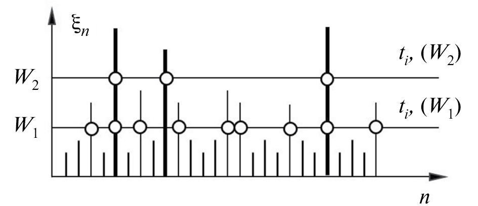 В соответствии с рис. 6 точечный случайный процесс ti(W2) на уровне W2 есть результат «прореживания» потока ti(W1) с уровня W1. Следовательно, вероятности математического ожидания и дисперсии числа возможных превышений уровня p+(Wj) будут уменьшаться. Их разность является информацией о вероятности нахождения значений исследуемой случайной последовательности ξn в диапазоне уровней ξ ∈ (W1, W2):
