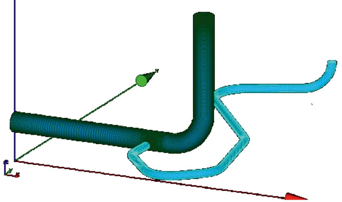 Геометрическая модель включает проточную часть горячей нитки ГЦТ, относящейся к петле с КД, и соединительного трубопровода КД (рис. 4). Внутренний диаметр главного циркуляционного трубопровода составляет 850 мм, внутренний диаметр соединительного трубопровода компенсатора давления – 346 мм. Длина трубопровода от выходного патрубка реактора до коллектора ПГ ~10 м, длина трубопровода от выходного патрубка реактора до врезки соединительного трубопровода ~ 7 м.