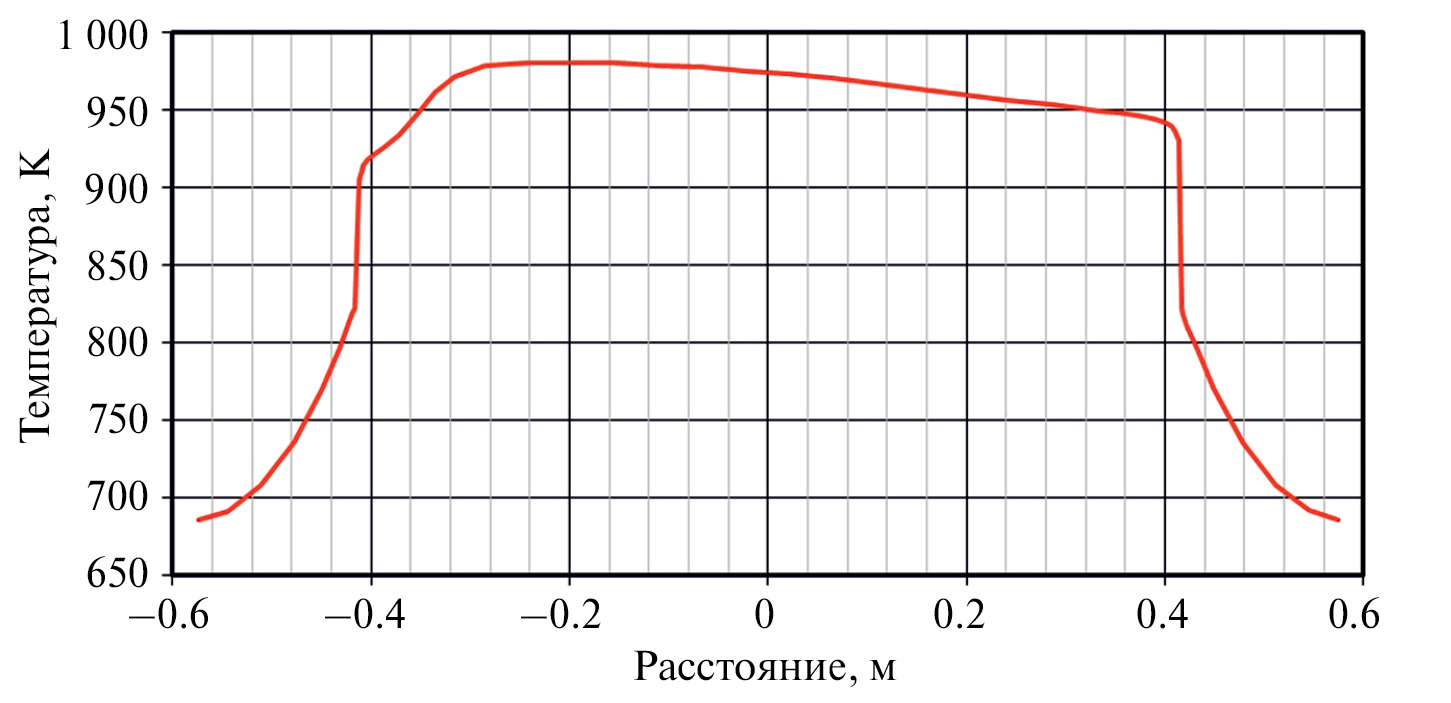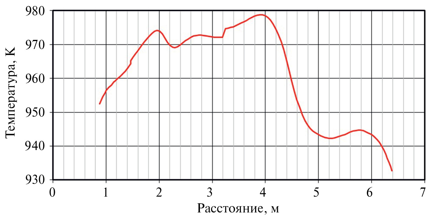 Рис. 11. Профиль температуры вдоль линии “б” (2500 с расчета)