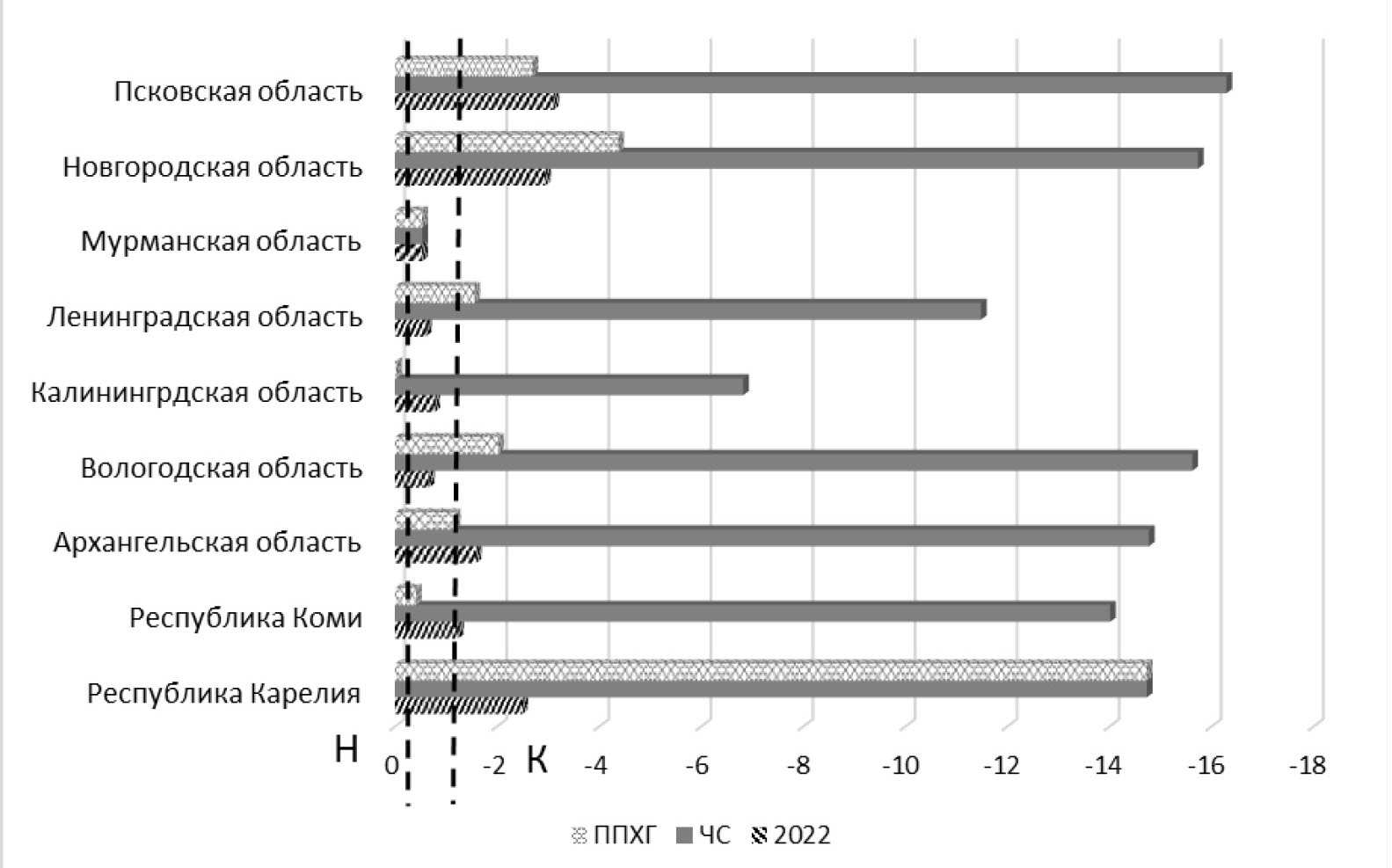 Качественная интегральная оценка с учетом ППХГ представлена в табл. 9 и на рис. 2, с целью оценить изменившуюся ситуацию в регионах С-ЗФО с позиций обеспечения требуемого уровня ЭБ.