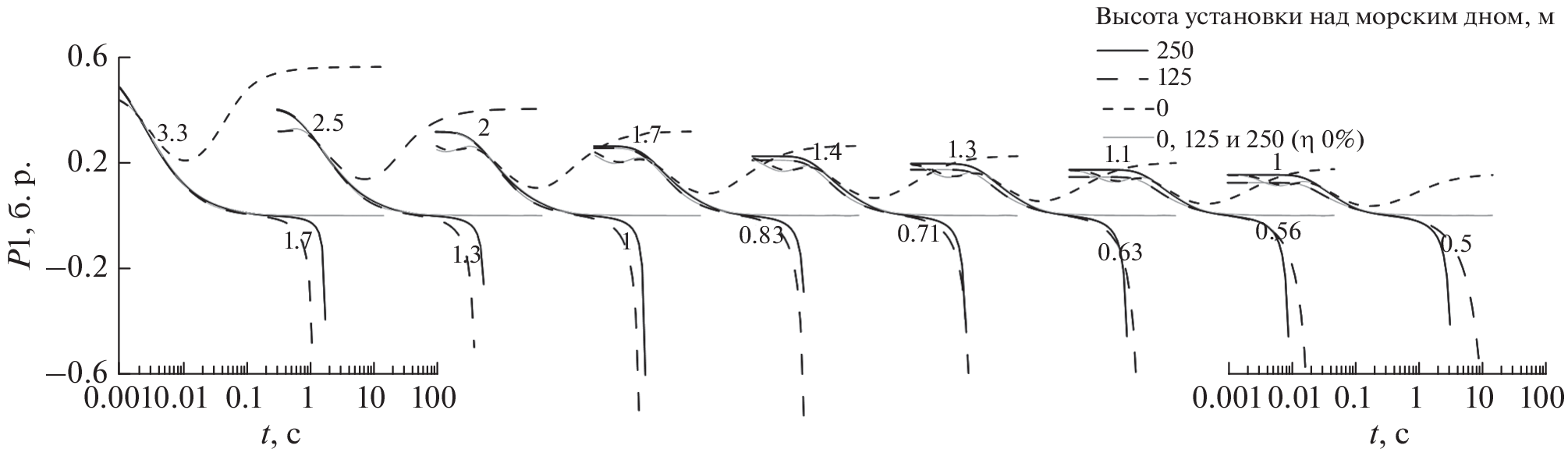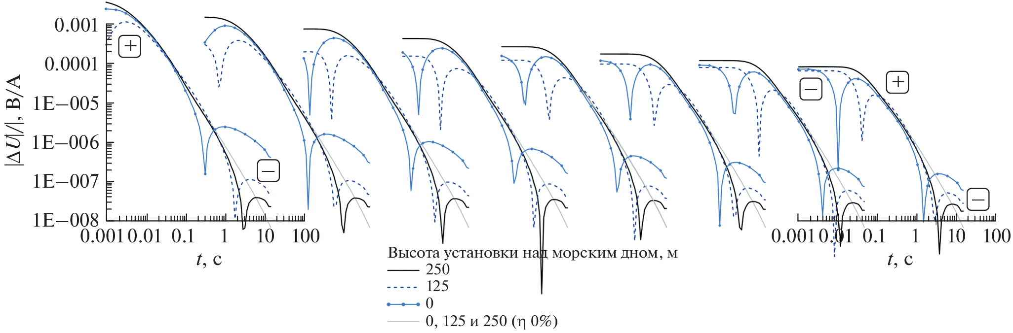 A change in the non-stationary electromagnetic (EM) signal over the conducting polarizable Earth covered by sea water on measuring lines located in the axial and equatorial regions of the source – a pulsed horizontal electric line (HEL) – is considered. When the HEL operates under pulsed conditions, it creates a galvanic and eddy current in the medium. If the medium affected by the HEL is heterogeneous, both influences lead to the separation of bound charges. After attenuating the impact of an artificial source, relaxation (depolarizing) processes of various nature appear in such a medium, manifesting themselves, in particular, in the form of an EM signal. As a result, the transient process recorded by the grounded line after the pulsed effect of the HEL is at least a superposition of three components: the transient electromagnetic (TEM) signals, galvanically induced polarization (GIP) and inductively induced polarization (IIP). As the contribution of the TEM field component to the overall signal decreases, the IP signal is manifested in the transient process by a change in the time response of the decay, to the point where the signal reverses polarity. As shown earlier by numerical simulations for the axial region of the HEL, the manifestation of the IIP signal at late transient process times, for most of the geoelectric conditions on land, is invisible against the GIP manifestation (Ageenkov et al., 2020). These calculations also show that in the axial region, the GIP signal manifests itself in the form of a deceleration of the transient process rate, and the IDP signal – an acceleration of the decay rate, to the point where the signal changes its sign. Field measurements performed by the aquatic differential-normalized method of electrical prospecting (ADNME), which uses axial electrical installations, record transient processes with a change in the time response of the decay: it becomes more delayed or, vice versa, runs faster and may be accompanied by a change in the polarity of the signal. In other words, measured signals of different forms are observed, which are presumably associated with the manifestation of the GIP or IIP signals. The relevance of the publication lies in the need to explain the results of field measurements performed offshore, to understand the relationship between the course of the transient process and the geoelectric conditions existing in the water area. And in general, to describe the formation of the transient response of the medium in the axial and equatorial region of the HEL for the conditions of aquatic geoelectrics. The calculated signal for axial and equatorial electrical installations with several spacings under the conditions of the sea shelf water area is studied when the installation is located on the surface of and inside the water layer, and on the seabed of the water area – on geological formations. For axial installations, calculations are made of the quantities used in the ADNME: the transient process ΔU(t), the finite difference of the transient process Δ2U(t) and the transformant P1(t) – the ratio of Δ2U(t) to ΔU(t). For equatorial installations, the signal ΔU(t). is calculated. The signals of a two-layered model of the medium with polarizable and non-polarizable bases are compared.
