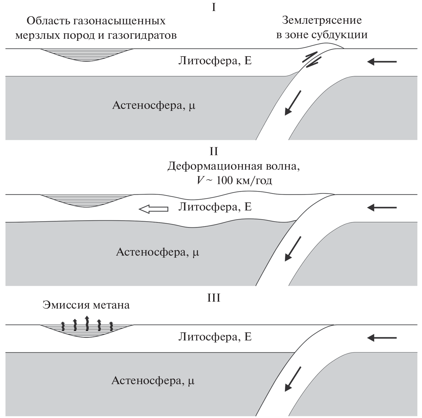 - Lobkovsky, L.I., Baranov, A.A., Ramazanov, M.M., Vladimirova, I.S., Gabsatarov, Y.V., Semiletov, I.P., Alekseev, D.A. Trigger Mechanisms of Gas Hydrate Decomposition, Methane Emissions, and Glacier Breakups in Polar Regions as a Result of Tectonic Wave Deformation. Geosciences. 2022. V. 12(10). P. 372.