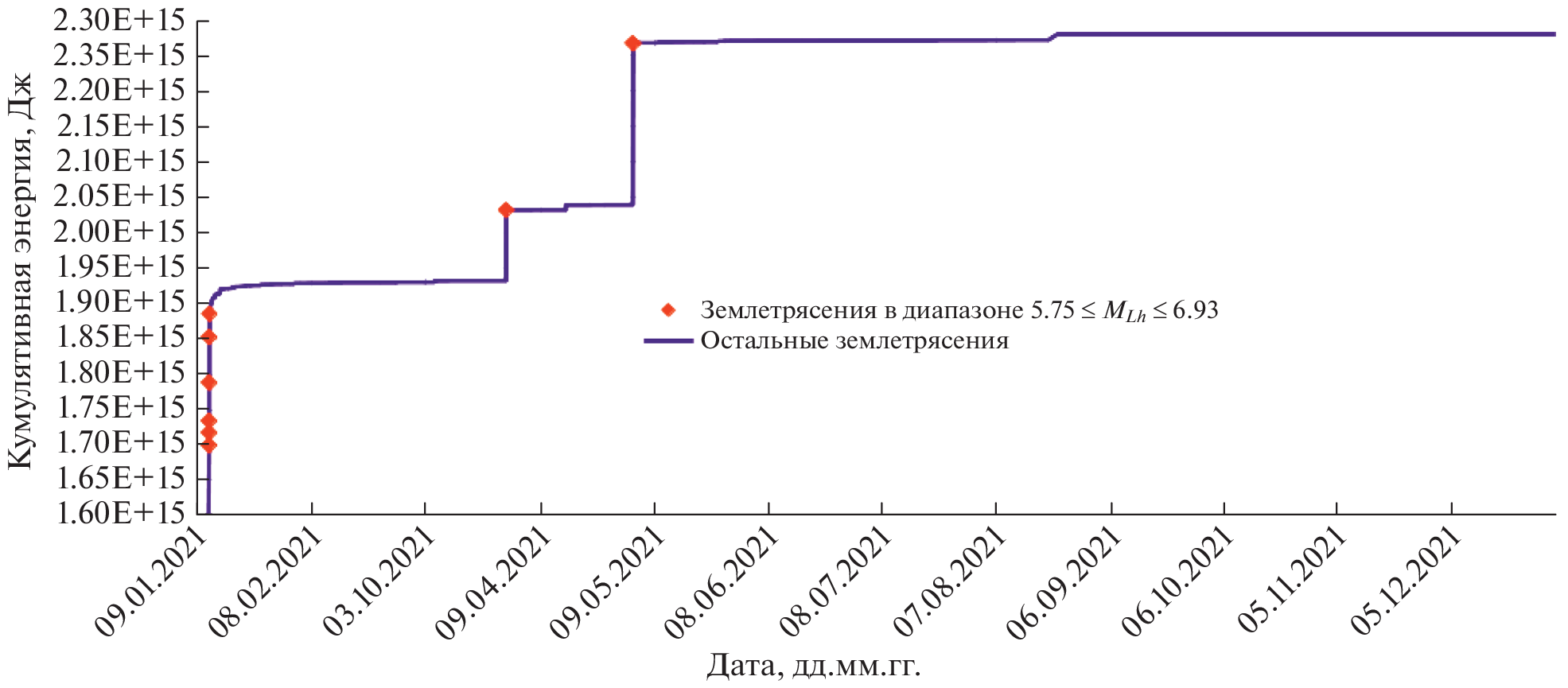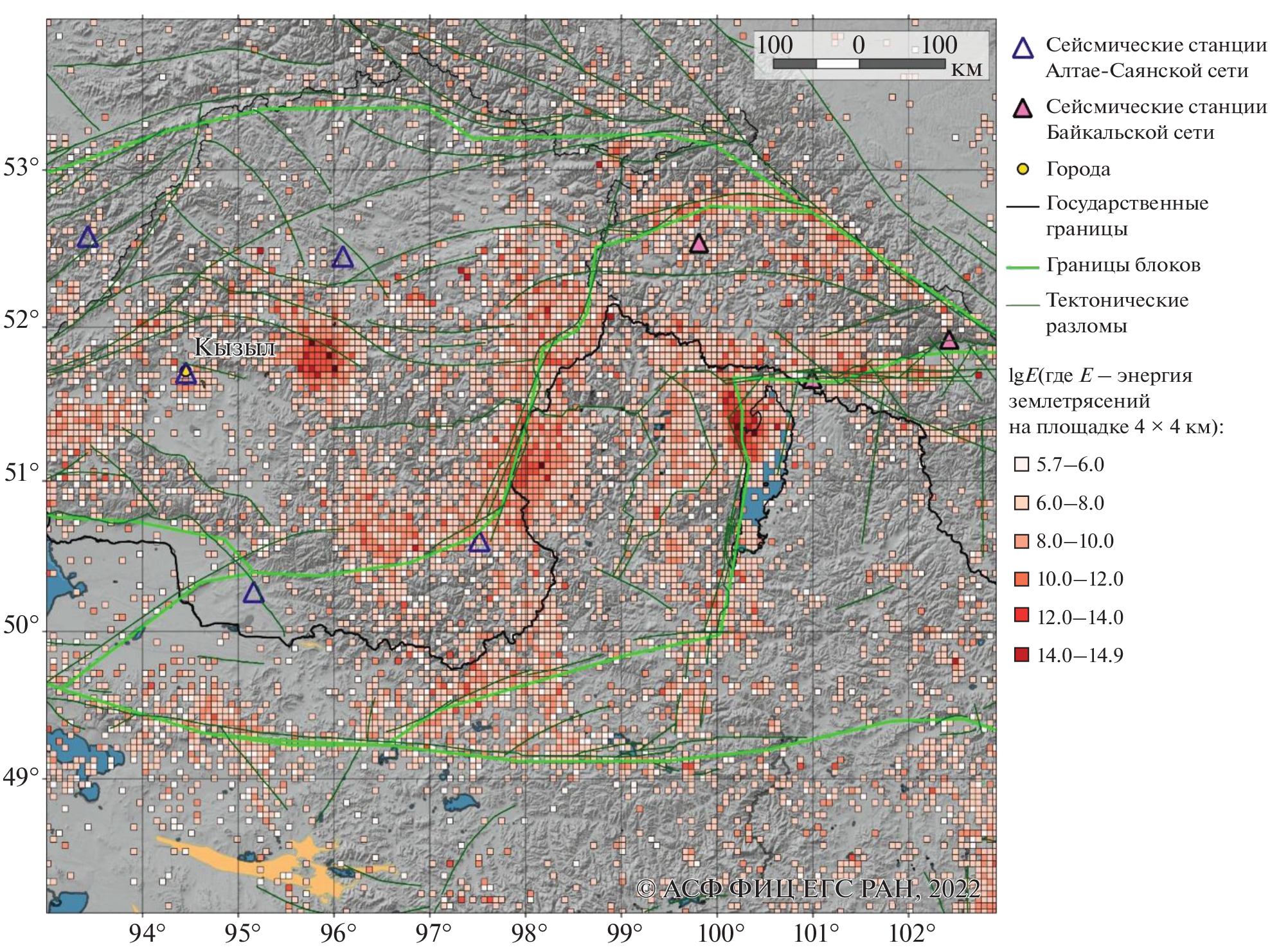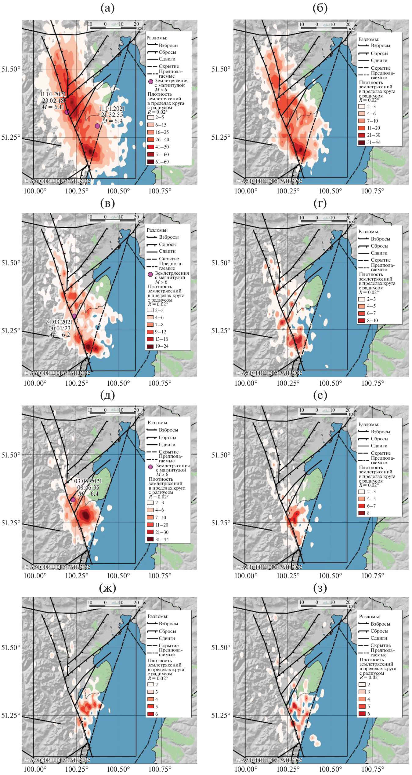 —The paper presents the studies of the Khuvsgul earthquake on January 11, 2021 at 21:32 UTC (January 12, 2021 at 05:32 local time), MW = 6.7, ML = 6.9, and the seismicity structure in the aftershock period for the Altai-Sayan mountain region and the Baikal rift zone, where the epicenter of this earthquake was located. Two faults are seismically activated, diverging from the southern end of the aftershock area at an acute angle: one in the northeast and one in the northwest direction, as well as transverse faults between them. According to the epicenter position and studies of the source area by other authors, the main event corresponds to the northeastern fault, and large aftershocks occurred at the junction of the northwestern fault with transverse faults feathering from the east. The main event was immediately followed by a series of large aftershocks, the strongest of which occurred on March 31, 2021 with ML = 6.2 and on May 3, 2021 with ML = 6.4. Spatial changes in the seismic regime of the aftershock region led to the predominant activity of its southern end. The junction area of the collisional structures of the Altai-Sayan folded zone and the rift structures of the Baikal depressions system is distinguished in seismicity as a block structure with increased seismicity near the block boundaries. First of all, these are the Tuva-Mongolian block and the eastern part of the Sayano-Tuva block. After the Khuvsgul earthquake of 2021, a block structure with the activation of the epicentral zones of the 1991 Busingol earthquake, the 2011–2012 Tuva earthquakes, and other structures seismically active until 2021 has increased seismic activity. It is proved that the 2014 Khubsgul earthquake occurred under the basin of the same name and is associated with other faults than the 2021 earthquake and is not a direct precursor of the 2021–2022 activation.