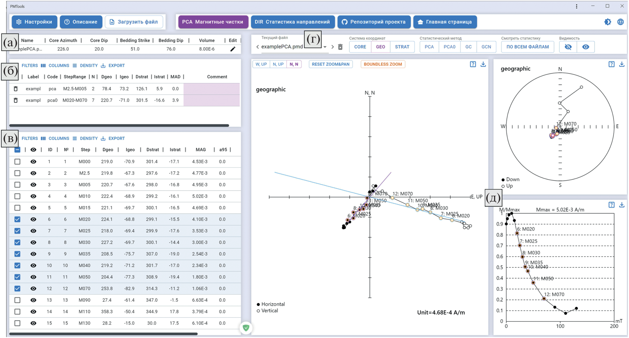 —This paper introduces PMTools (https://pmtools.ru), a novel cross-platform open-source web application designed for the analysis of paleomagnetic data. Our software offers a user-friendly interface and supports the most commonly used data formats in paleomagnetism, including .pmd, .dir, .pmm, .rs3, .squid, .vgp, and .gpml. It encompasses all the necessary functionalities for conducting principal component analysis of natural remanent magnetization and computing mean paleomagnetic directions along with corresponding virtual geomagnetic (paleomagnetic) poles. PMTools facilitates the application of various paleomagnetic tests to user data, such as the fold test, conglomerate test, and reversals test. Notably, the application allows for seamless import and export of paleomagnetic data (tables) in formats compatible with .csv and MS Excel. Additionally, all generated figures can be exported as high-quality vector graphics in .svg format, specifically designed for direct integration into publications and presentations. Furthermore, PMTools enables the export of sets of paleomagnetic poles in GMap and GPlates software formats, enabling researchers to promptly use their paleomagnetic data for paleotectonic reconstructions. PMTools has an intuitive interface, customizable hotkeys, and an extensive array of graph elements, all of which contribute to making PMTools an appealing, cutting-edge tool for processing and analyzing the results of paleomagnetic studies.