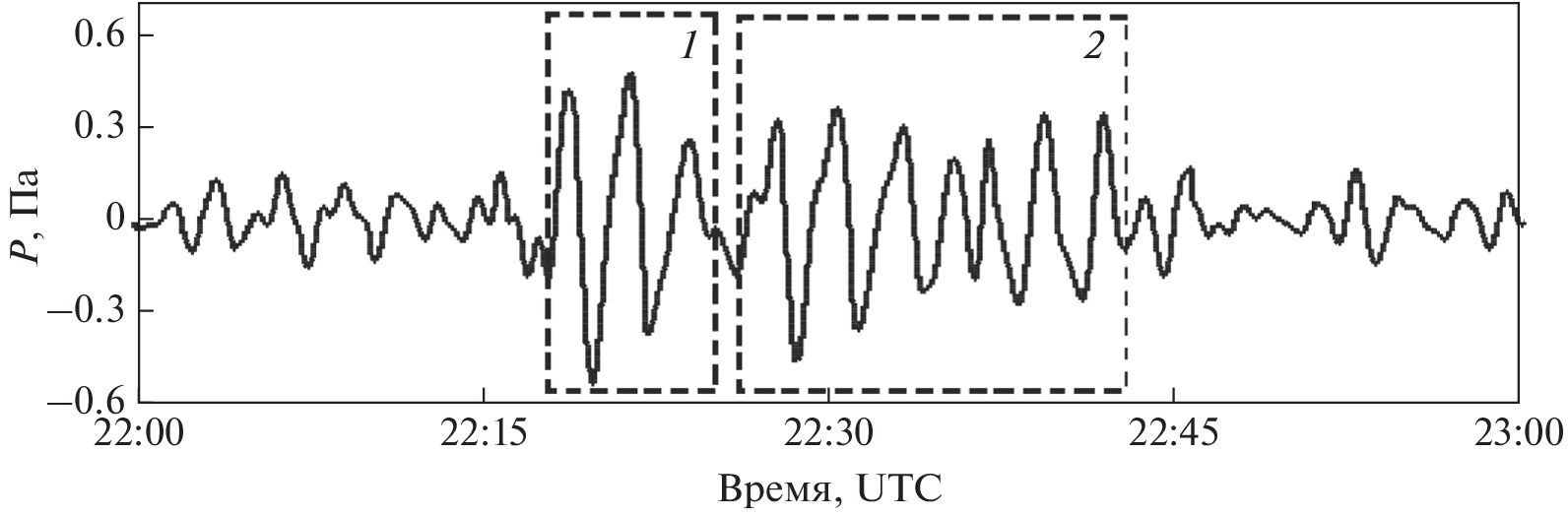 Abstract—The magnetic effects of strong earthquakes are considered using the example of a unique event: two underwater earthquakes of magnitude 6.0 and 7.3 that occurred on March 16, 2022 at close times (at 14:34 and 14:36 UTC, respectively) with a distance between sources of ~11 km. With the use of data from the Mikhnevo geophysical observatory of the IDG RAS (MHV) and a number of magnetic observatories of the INTERMAGNET international network, it is shown that in the absence of global geomagnetic disturbances, earthquakes were accompanied by characteristic variations of the Earth’s magnetic field recorded as a train of alternating geomagnetic field oscillations with an amplitude of ~2–8 nT and a period of ~30 min almost simultaneously at ~15:30 UTC by all magnetic observatories located at distances from 210 to ~13 000 km, as well as by variations in the periods of passage of the seismic and infrasonic signal in the MHV.