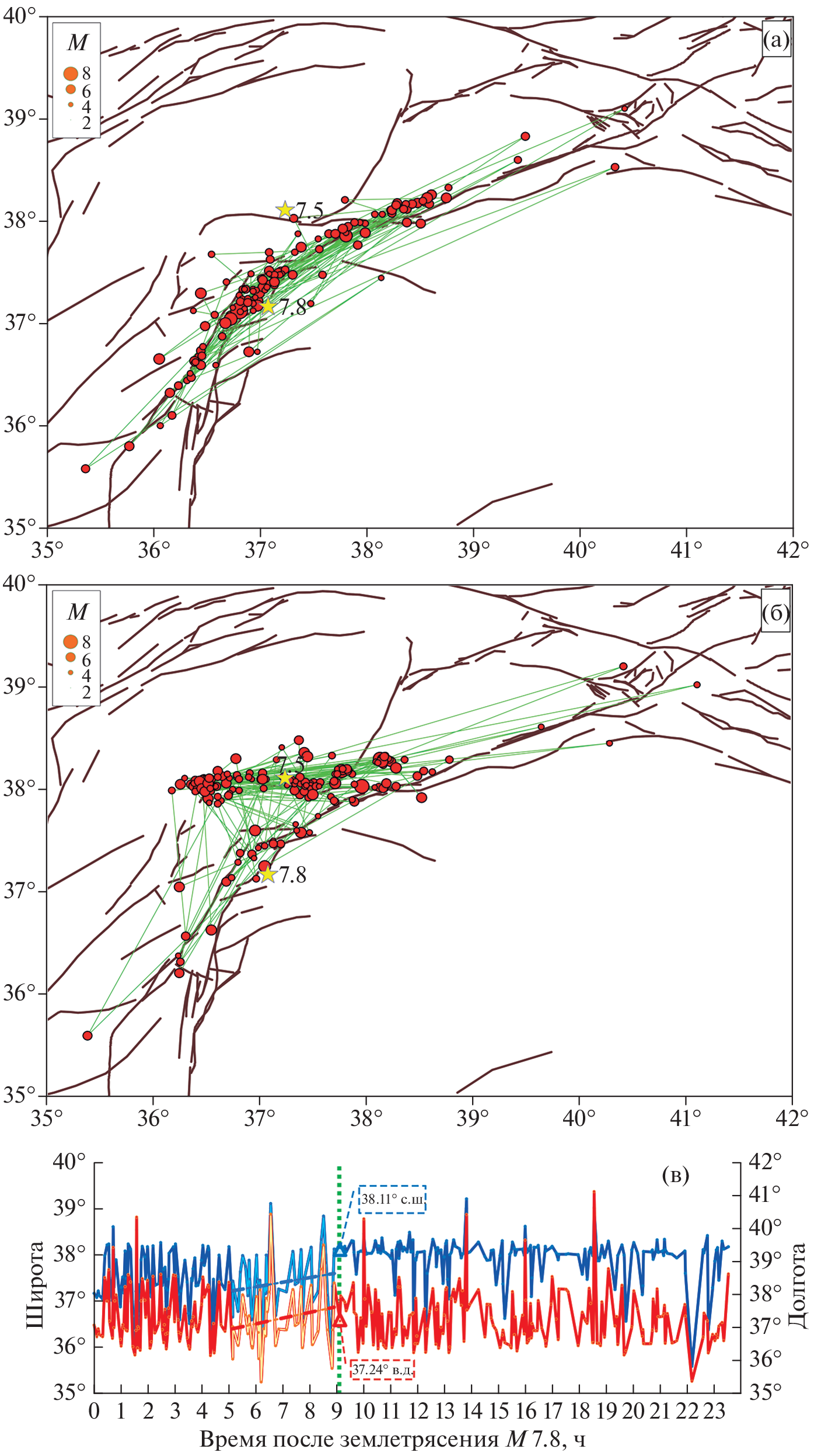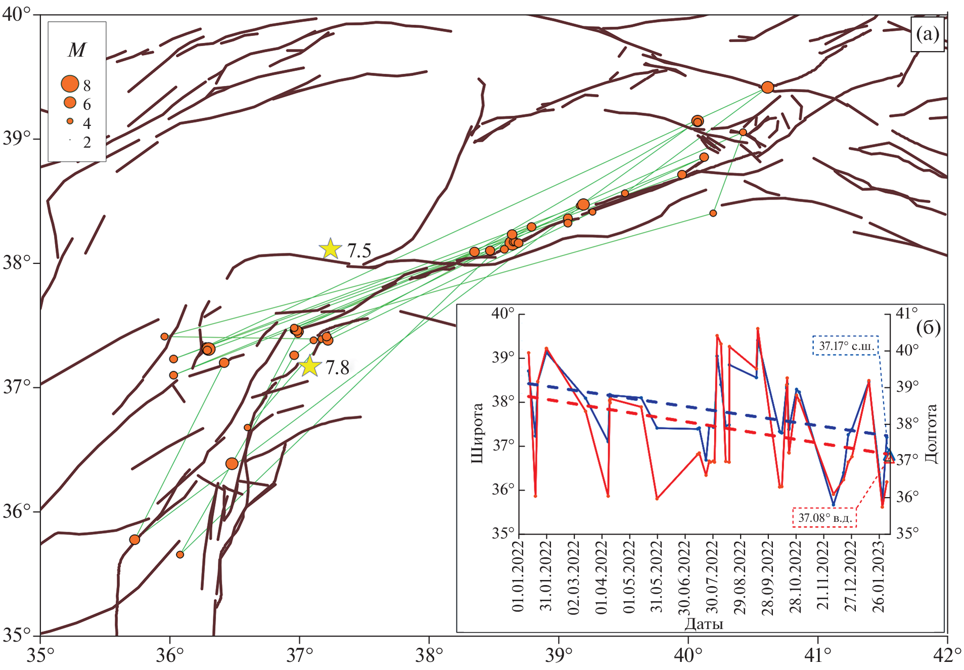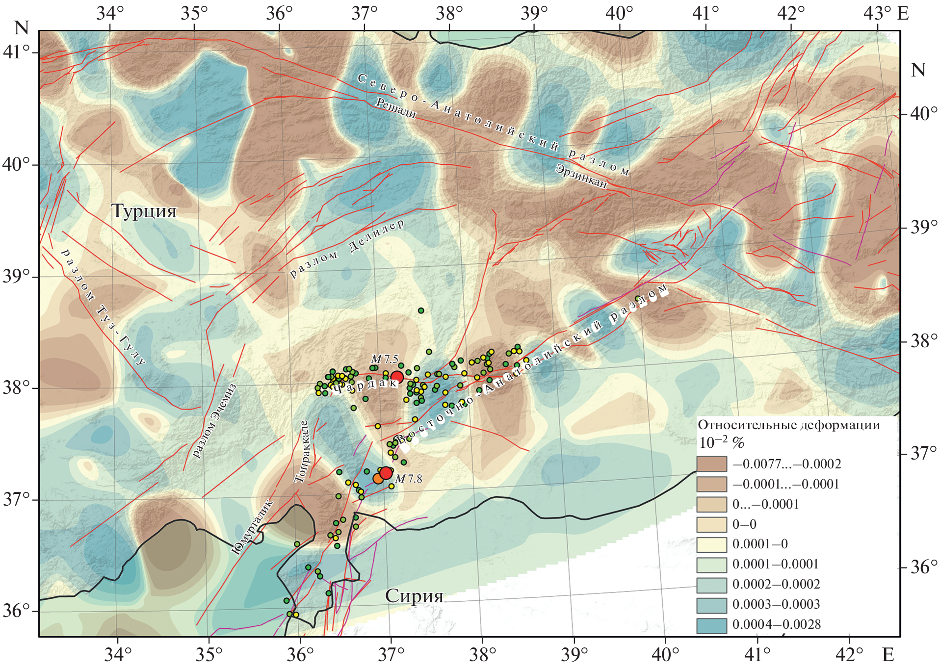 —In this paper, we carried out a kinematic analysis of the movements of plates and blocks of the region based on a homogeneous database of displacement velocities of GNSS permanent monitoring stations for the region of southeastern Turkey, where strong earthquakes occurred on February 6, 2023. Along the East Anatolian fault zone from 2008 to 2018, the Arabian Plate was established to shift relative to the Anatolian Plate, corresponding to a left shift (without a normal component) at a rate of 1 cm/yr in the eastern part to 0.8 cm/yr in the western part. Displacements occurred along the Chardak fault, corresponding to a left-hand strike-slip fault, at a rate of less than 0.7 cm/year. The revealed kinematics is confirmed by focal mechanisms and cosesismic displacements of the studied earthquakes. The M7.5 earthquake that occurred directly on the Chardak fault is not an aftershock of the M7.8 earthquake, but is a relatively independent event. An analysis of the seismic regime shows that the stresses on the East Anatolian fault after the main event M7.8 are relieved by the first large latitudinal fault zone (the Chardak fault). The results of our study suggest that the counterclockwise rotation of the Anatolian and Arabian plates associated with the opening of the Red Sea Rift is most likely decisive for the general kinematics of the plates in the region.