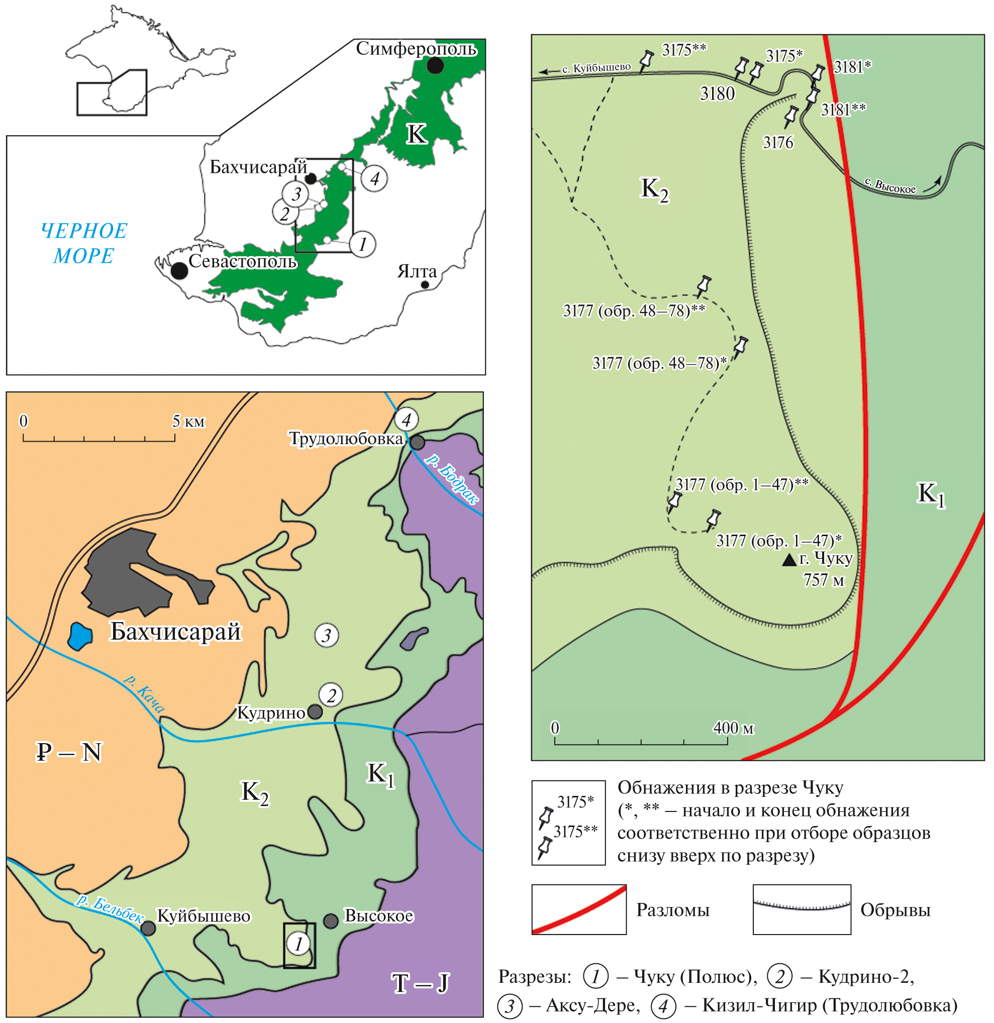 На территории Бахчисарайского района нами изучены 4 разреза турона–сантона. Разрез Кизил-Чигир (обн. 3186, 3172) расположен на западном склоне одноименной горы на северной окраине с. Трудолюбовка на правом берегу р. Бодрак. Разрезы Кудрино-2 (обн. 3184) на северной окраине с. Кудрино и овраг Аксу-Дере (3168) ~ в 2 км к северу от этого села находятся на правом борту долины р. Кача. Разрез Чуку близ с. Высокое опробовался на южном и восточном склонах горы Чуку (Полюс), которая является частью водораздела рр. Кача–Бельбек (рис. 1, рис. 2, табл. 1).