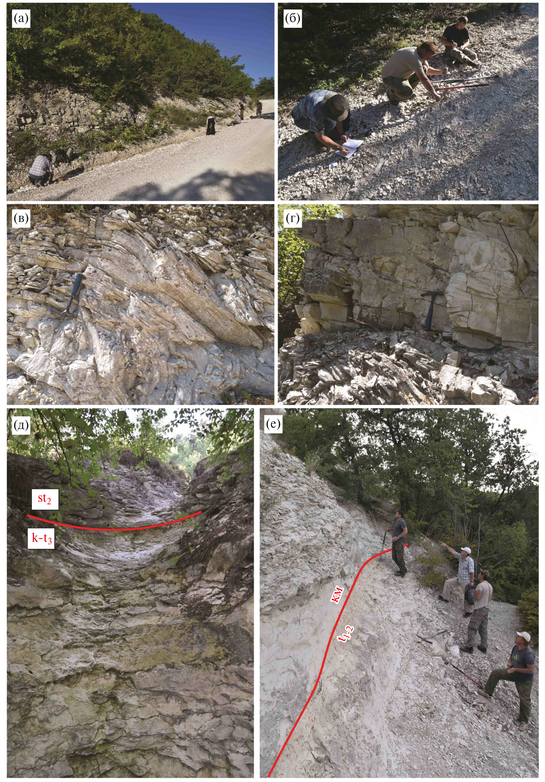 Рис. 2. Фотографии изученных обнажений в разрезе Чуку: (а) – обн. 3175 (верхний сантон); (б) – обн. 3177 (обр. 1–47) (нижний(?)-верхний сантон); (в) – обн. 3180 (верхний сантон); (г) – обн. 3176 (сантон?); (д) – разрез Аксу-Дере (обн. 3168, верхний турон–коньяк и низы верхнего сантона); (е) – разрез Кизил-Чигир (обн. 3172, граница между туроном и кампаном).