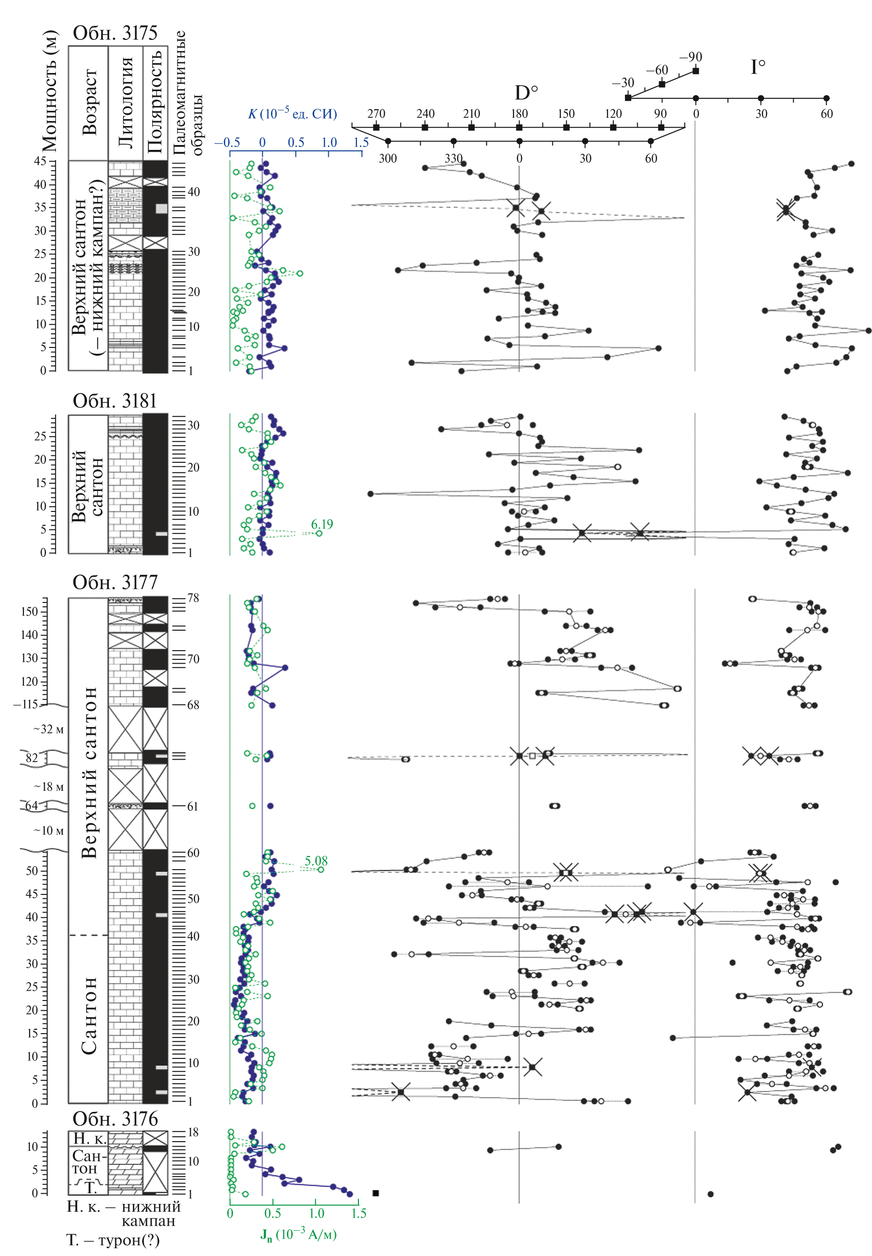 Рис. 4. Магнитостратиграфические характеристики турона(?) и сантона разрезов в районе г. Чуку. Условные обозначения см. на рис. 3. В обн. 3177 волнистыми линиями ограничены пропуски в обнаженности, мощность которых показана вне масштаба. Взаимное расположение обнажений 3176, 3175, 3176 и 3177 показано на рис. 10.