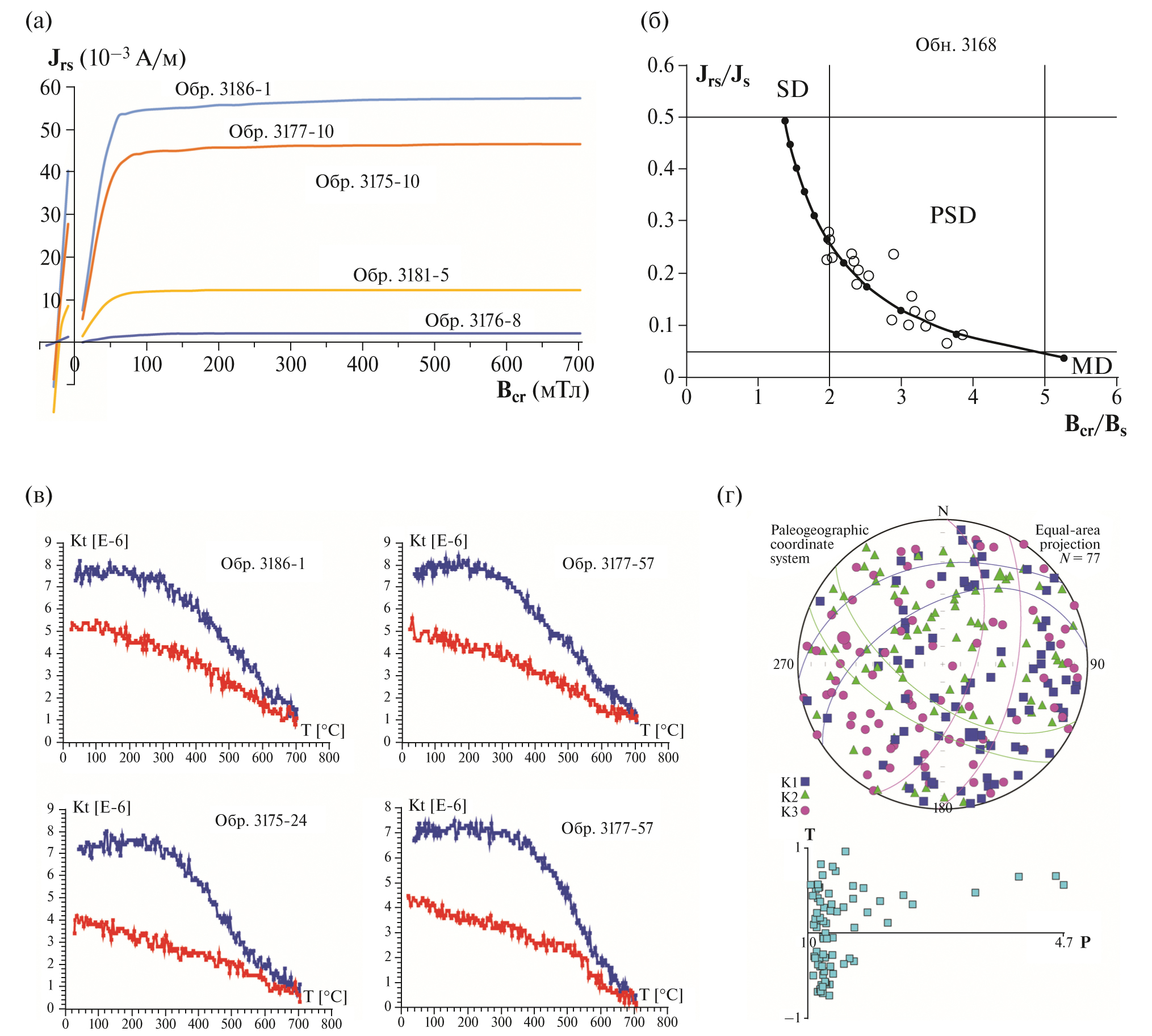 Рис. 5. Результаты магнито-минералогических исследований: (а) – кривые магнитного насыщения и разрушения; (б) – диаграмма Дея (SD, PSD и MD – области однодоменных, псевдооднодоменных и многодоменных частиц соответственно); (в) – кривые термомагнитного анализа (красный и синий цвета – нагрев и охлаждение соответственно); (г) – данные по анизотропии магнитной восприимчивости: стереограмма проекций длинных (K1), средних (K2) и коротких (K3) осей АМВ с овалами доверия в палеогеографической системе координат и диаграммы P–T (P – показатель анизотропии, положительные и отрицательные значения T указывают на уплощенные и удлиненные формы ферромагнитных частиц соответственно); n – число образцов в выборке.