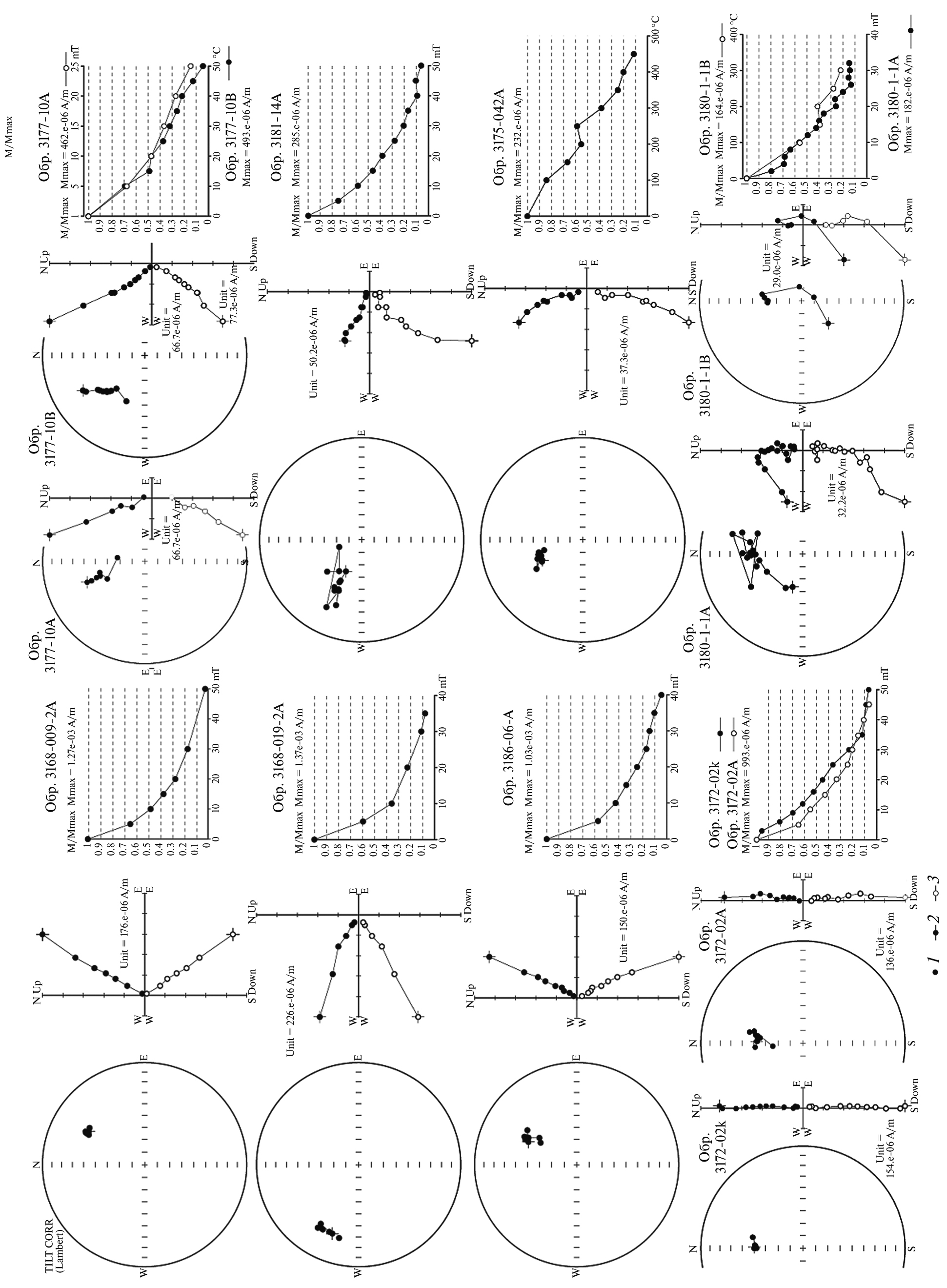 Рис. 6. Типичные результаты компонентного анализа (полярные стереопроекции, диаграммы Зийдервельда, графики размагничивания). Все данные приведены в стратиграфической системе координат. Условные обозначения: проекции Jn на нижнюю полусферу 1, на горизонтальную 2 и вертикальную 3 плоскости.